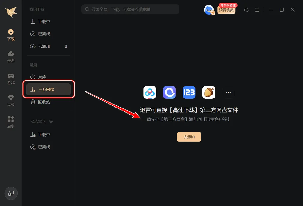 首先得安装迅雷最新的 12.4.4 版本,之后在 “常用” 板块的 “三方网盘” 栏目中,添加需要下载资源的对应网盘即可。