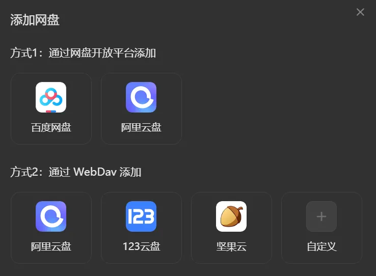 迅雷这次推出了两种添加方式:一种是主流网盘直连,通过官方API完成接入,像百度网盘、阿里云盘都包含在内;另一种是WebDav协议挂载,更适合自建存储或小众网盘,比如123网盘、坚果云等平台。