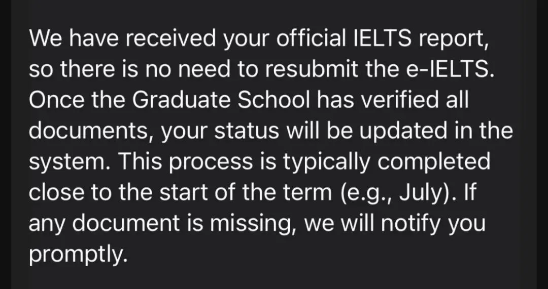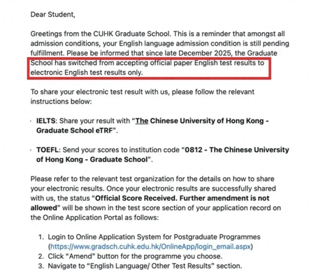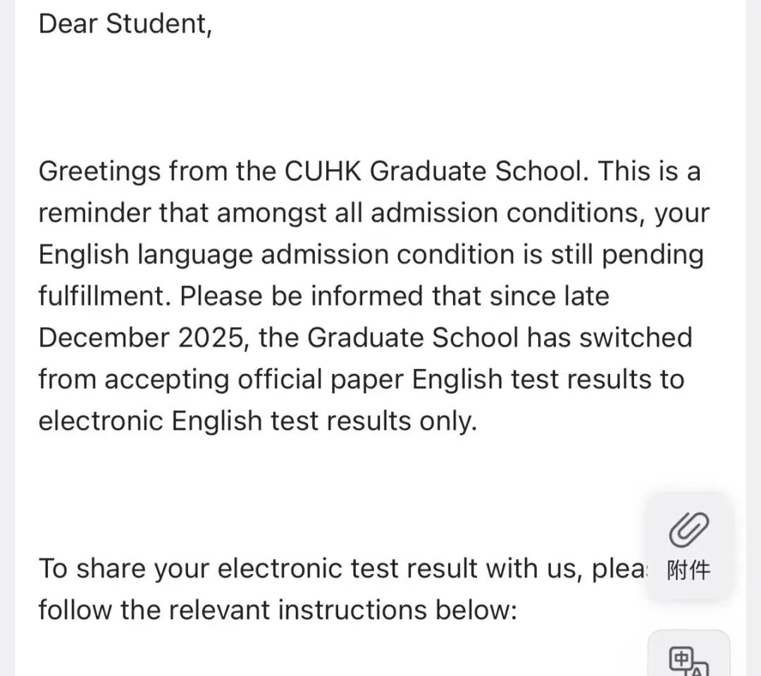 港中文最近更新了雅思成绩送分政策:从2025年12月起,研究生院已从接受官方直指英语考试成绩改为直接收电子英语考试成绩。