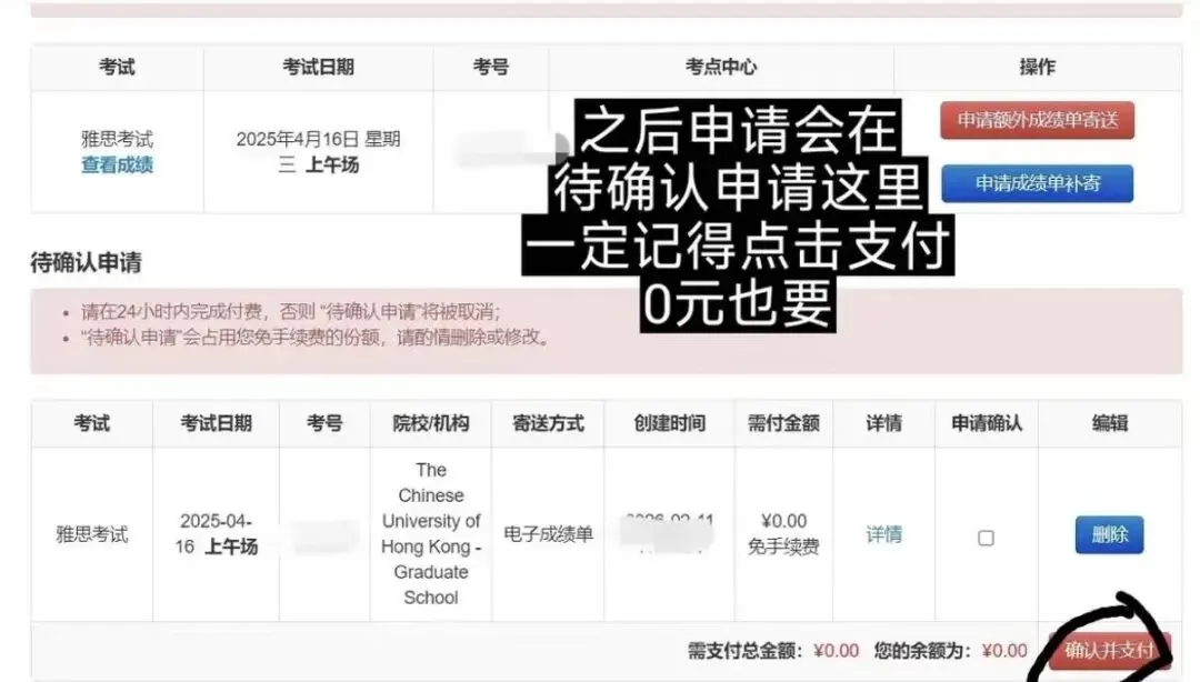 提交后,务必进入 “待确认申请” 板块,点击 “缴纳0元费用”,整个送分流程才算完成。