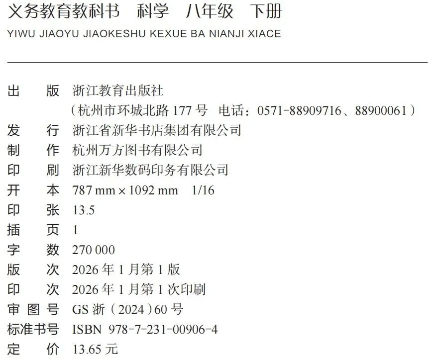【电子课本下载】( 官方正式版)2026年春季浙教版八下科学新教材