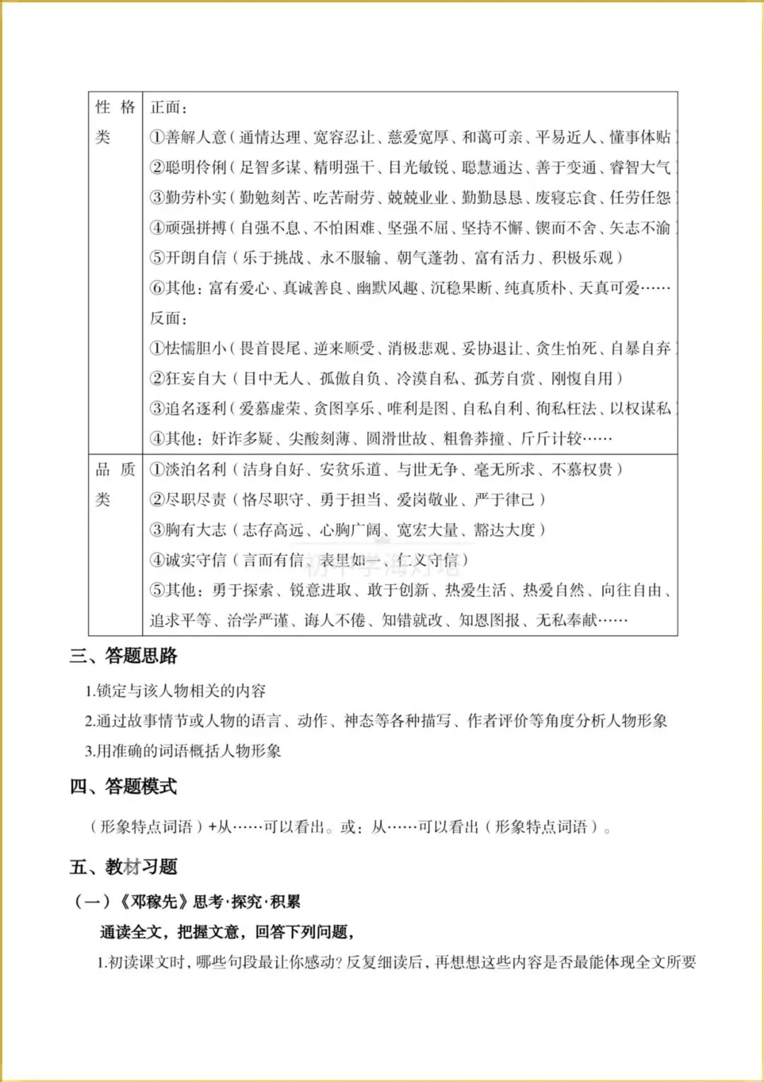 两大考点:①人物形象的概括与分析