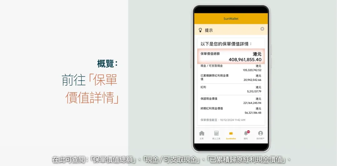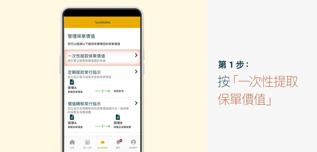 * 操作路径: My Sun Life APP → SunWallet → 提取保单价值 → 提取 → 输入提取金额 → 选择收款方式 → 收到确认界面