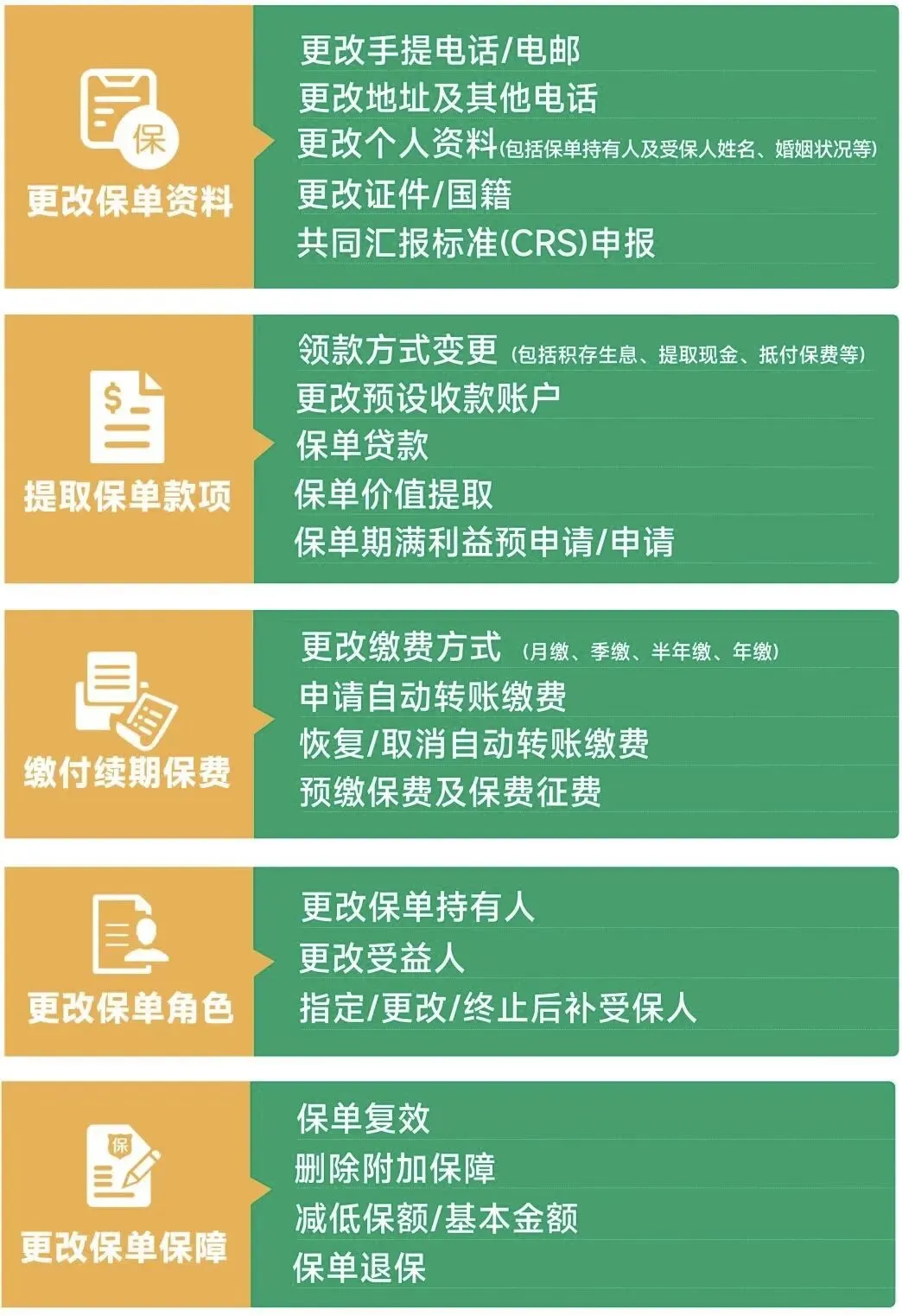 总之,现在的香港保险,真的已经不是大家印象中“繁琐”的代名词了,绝大多数业务例如:现金提取,变更投保人/受保人/受益人,货币转换,保单分拆 等等, 通过手机,动动手指就能办成,全程高效不需要再去香港了。
