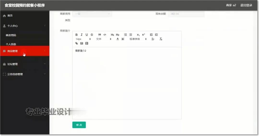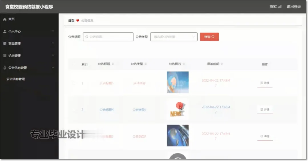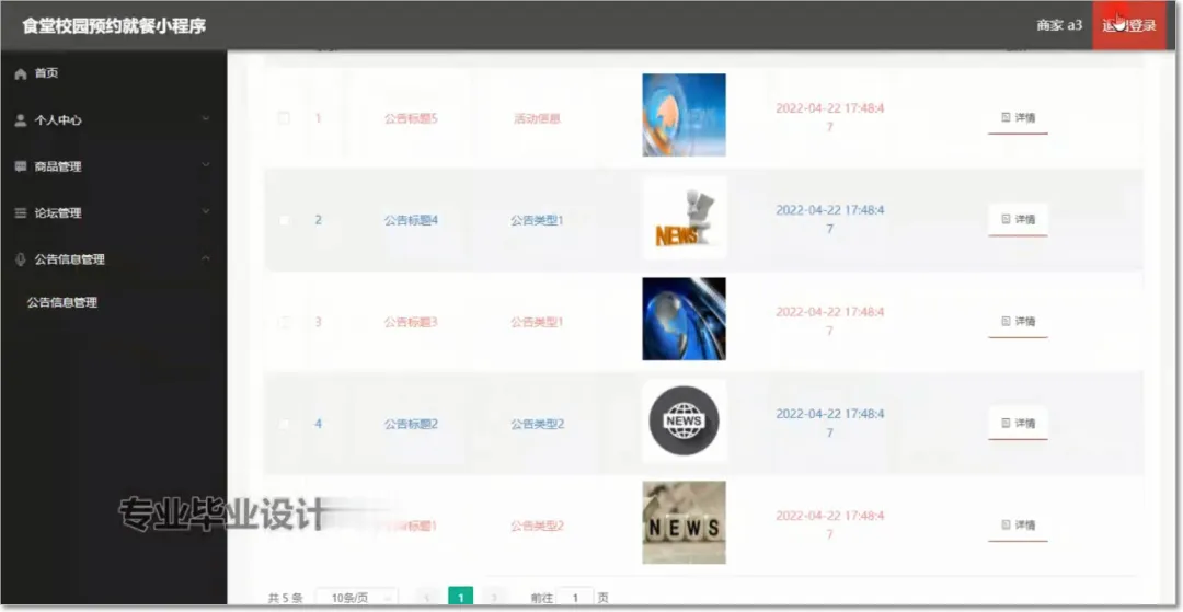 食堂校园预约就餐小程序使用Java语言进行编码,使用Mysql创建数据表保存本系统产生的数据。系统可以提供信息显示和相应服务,其管理员食堂校园预约就餐小程序信息,查看食堂校园预约就餐小程序信息,管理食堂校园预约就餐小程序信息。