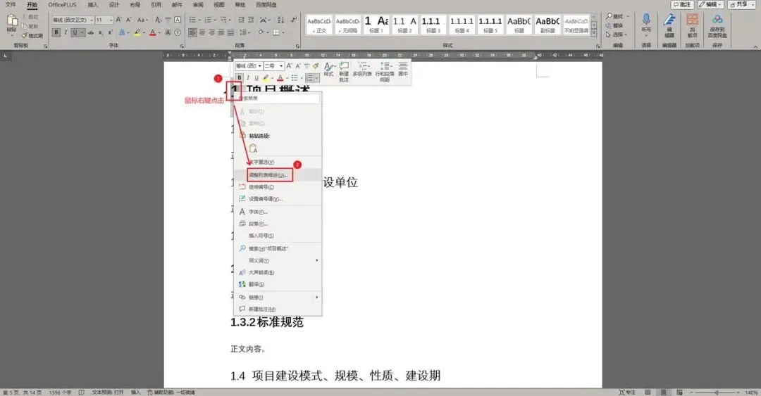 鼠标右键点击正文中的标题序号,选择“调整列表缩进”。