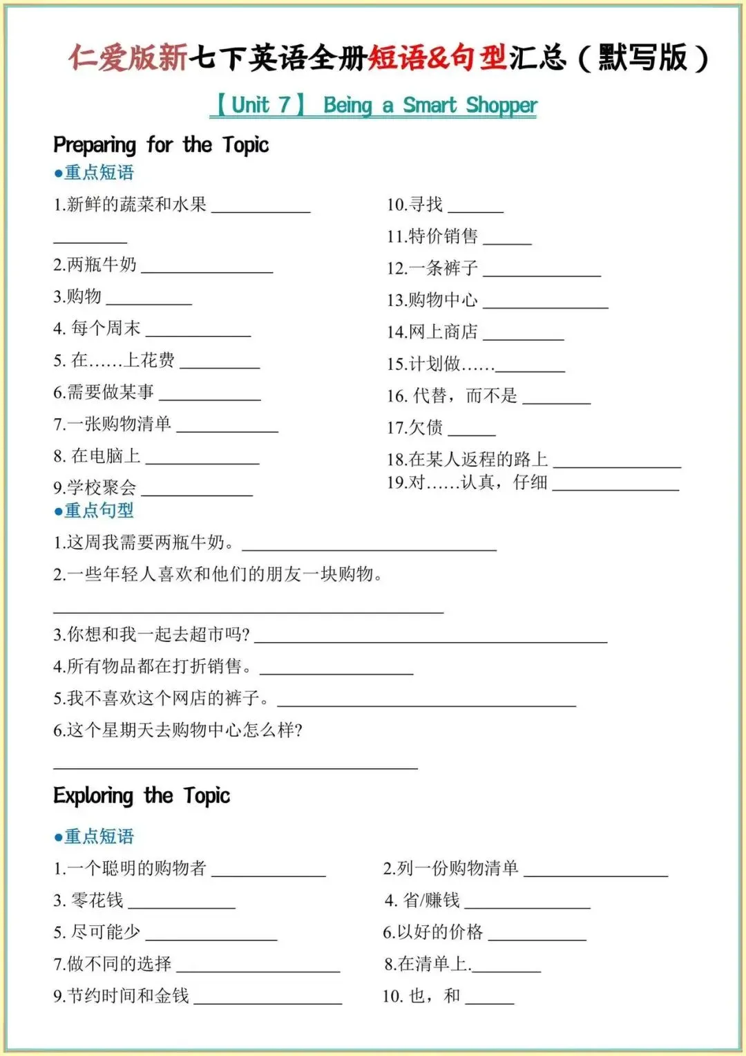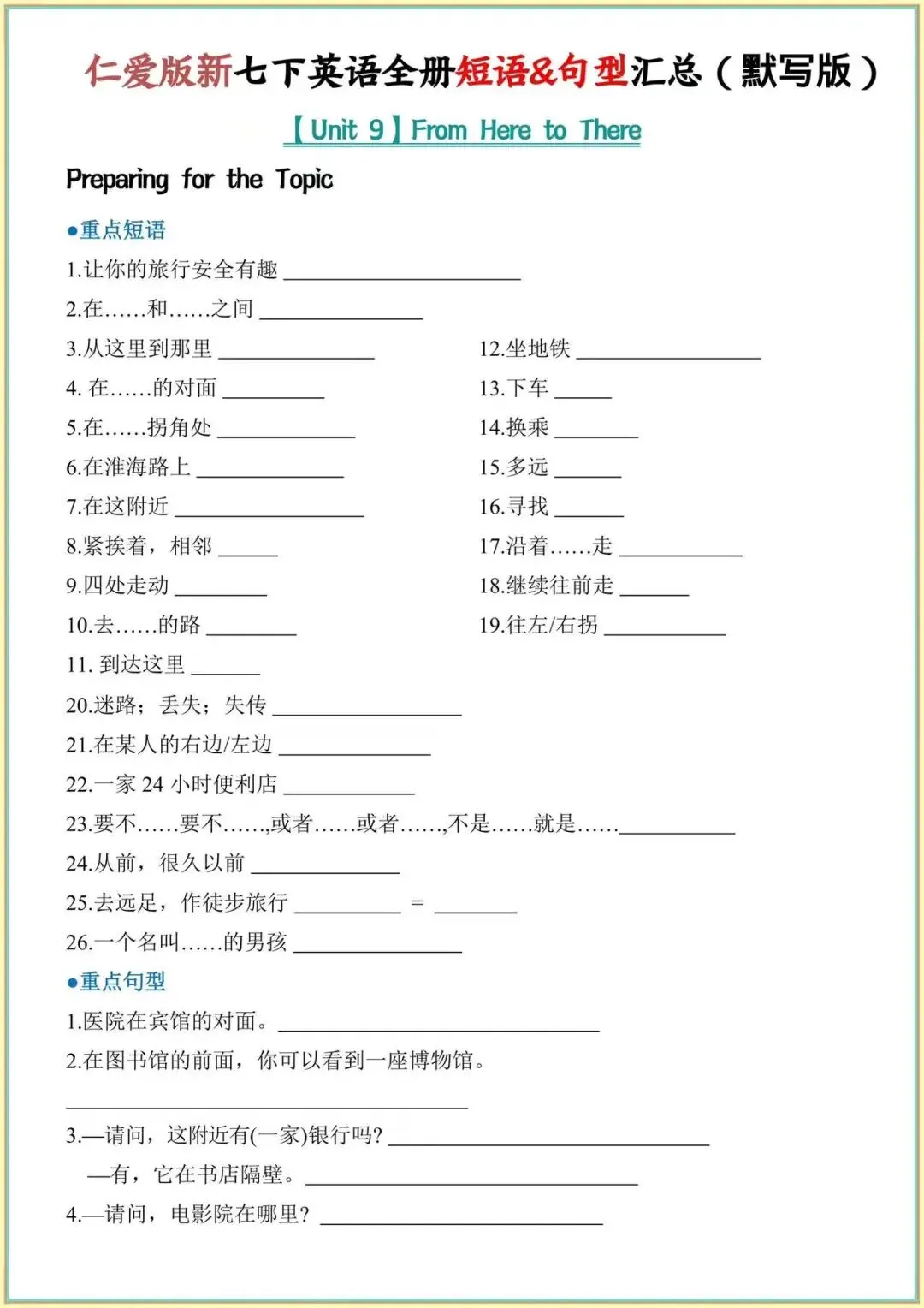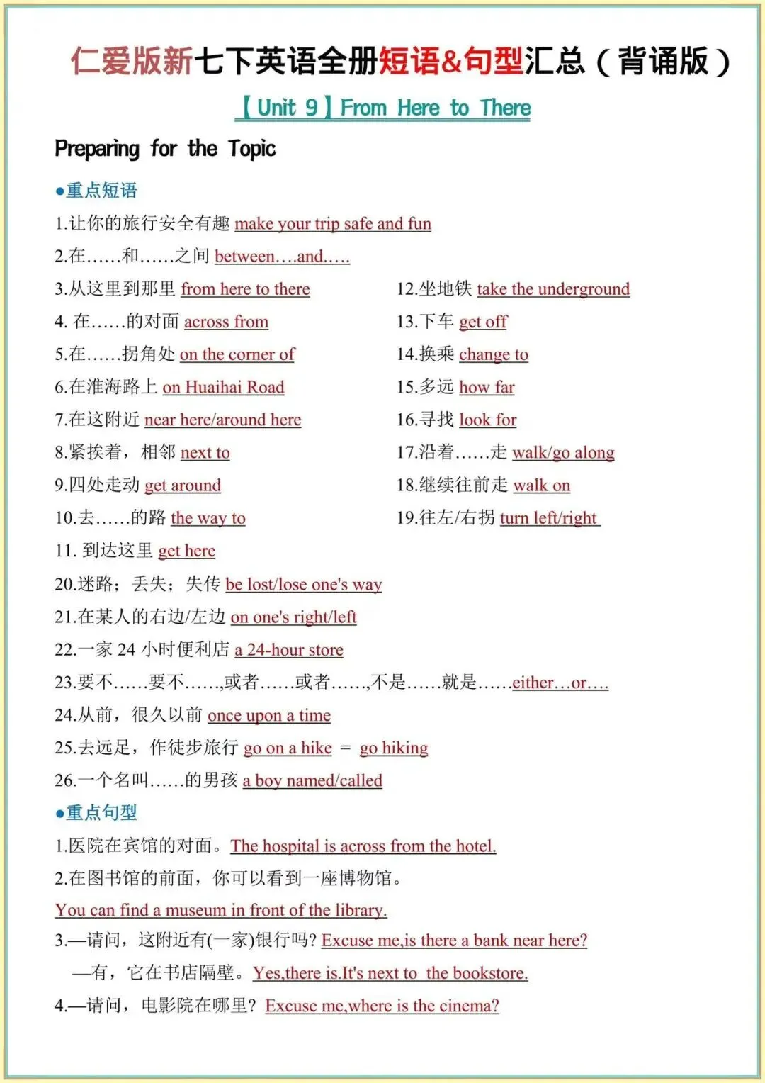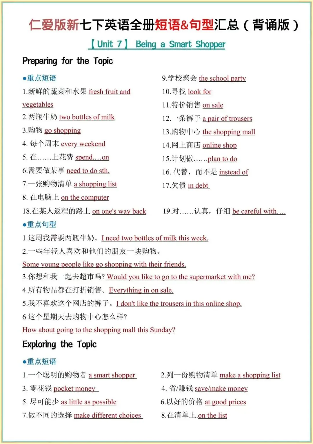 2026年仁爱版七下英语必背|全册重点短语+句型全汇总背诵+默写,背完考试稳了!完整电子版可打印!
