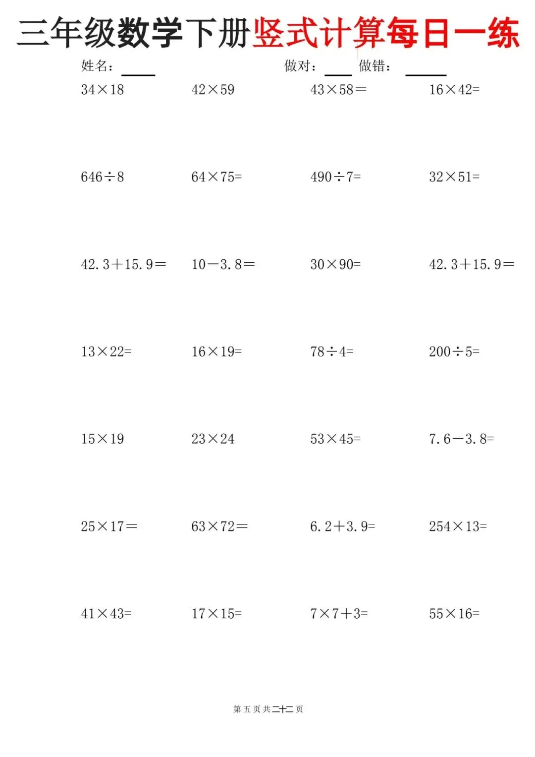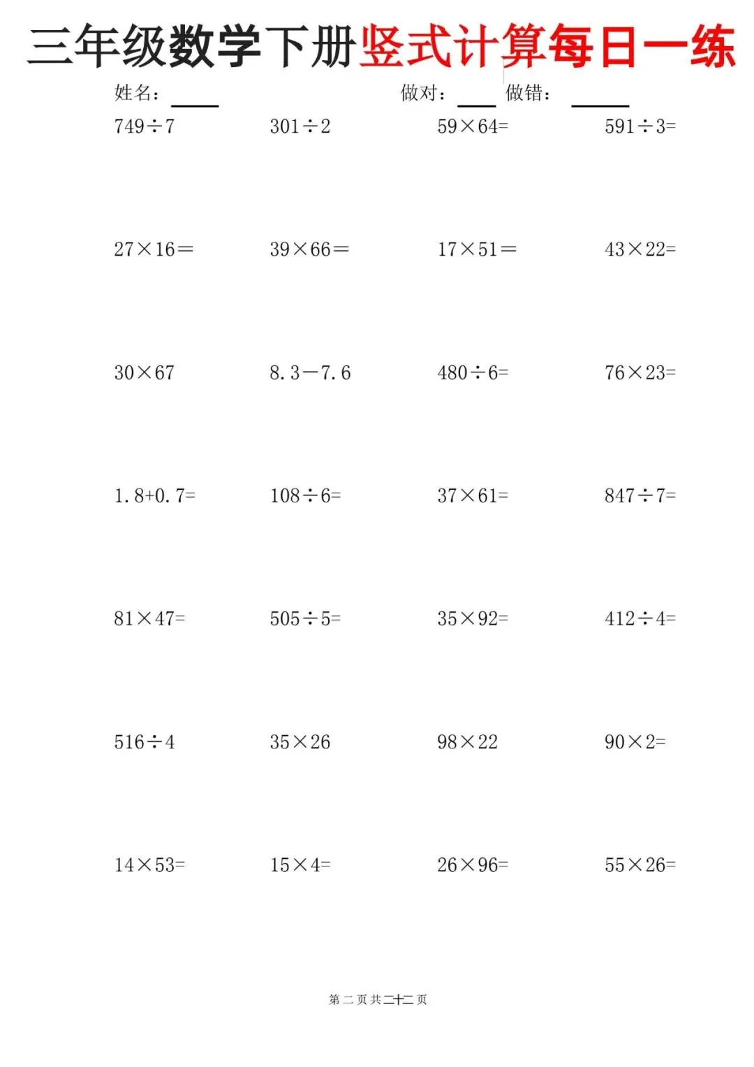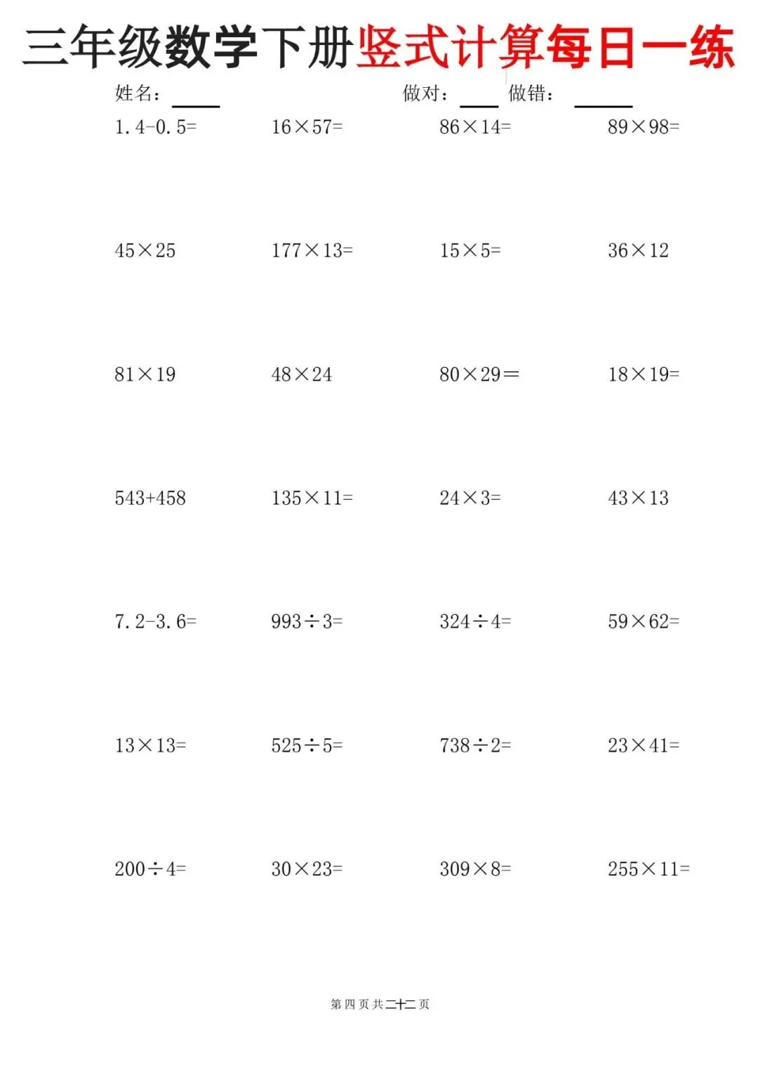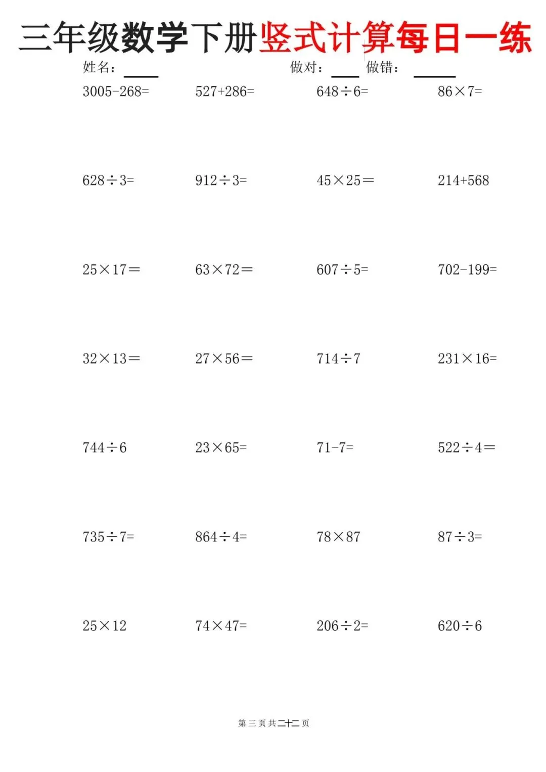 这份三年级下册数学竖式计算每日一练【可下载可打印】完整电子版共22页