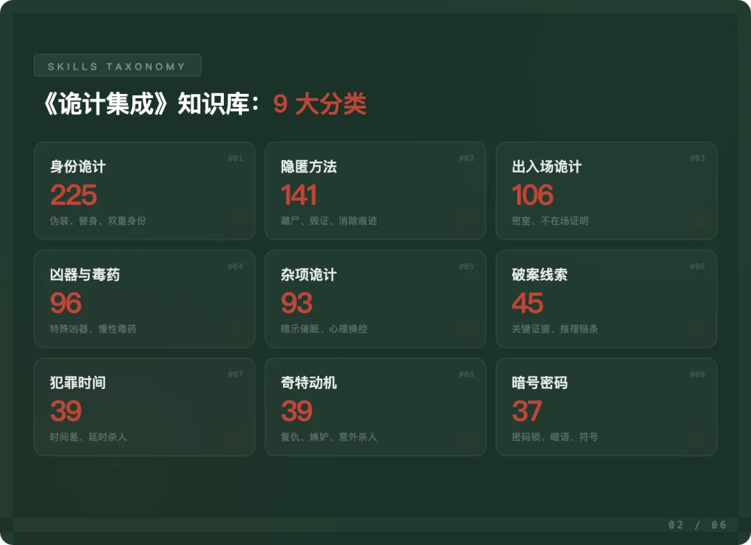 这一步的关键洞察是——游戏需要的是结构化的知识。 你不需要自己发明 821 条诡计,江户川乱步已经替你整理好了。你要做的,只是把这些知识”解锁”出来,变成机器能理解、能随机组合的格式。AI 能够基于这些技能,无限继续创造。