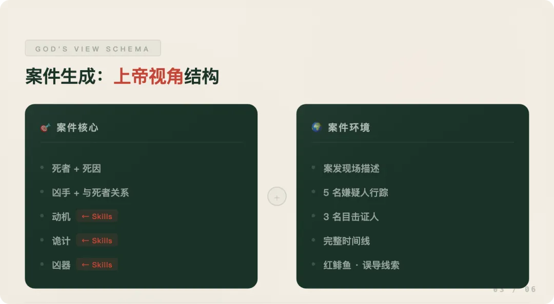 我设计了一个叫做“上帝视角 Schema”的结构,它是每一局案件的底层蓝图:
