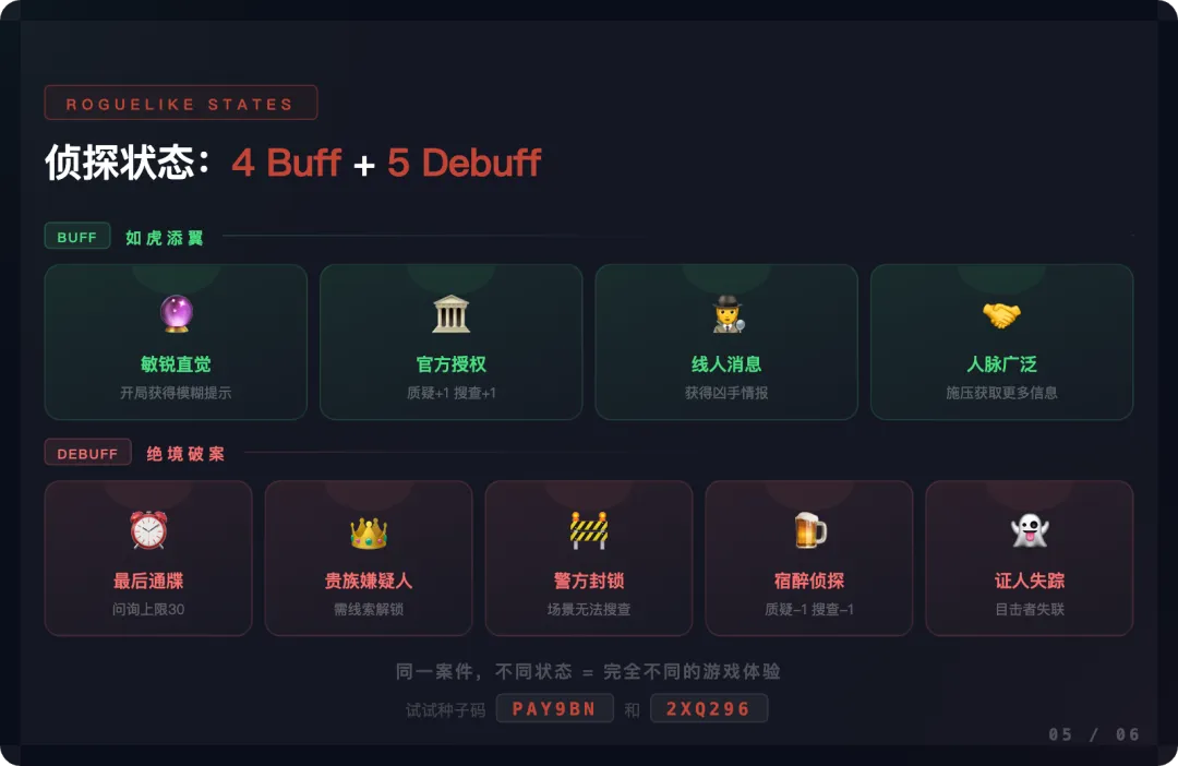 每局开始,系统随机给你一个”侦探状态”。可能是 Buff,让你如虎添翼;也可能是 Debuff,逼你在绝境中破案。4 种 Buff + 5 种 Debuff