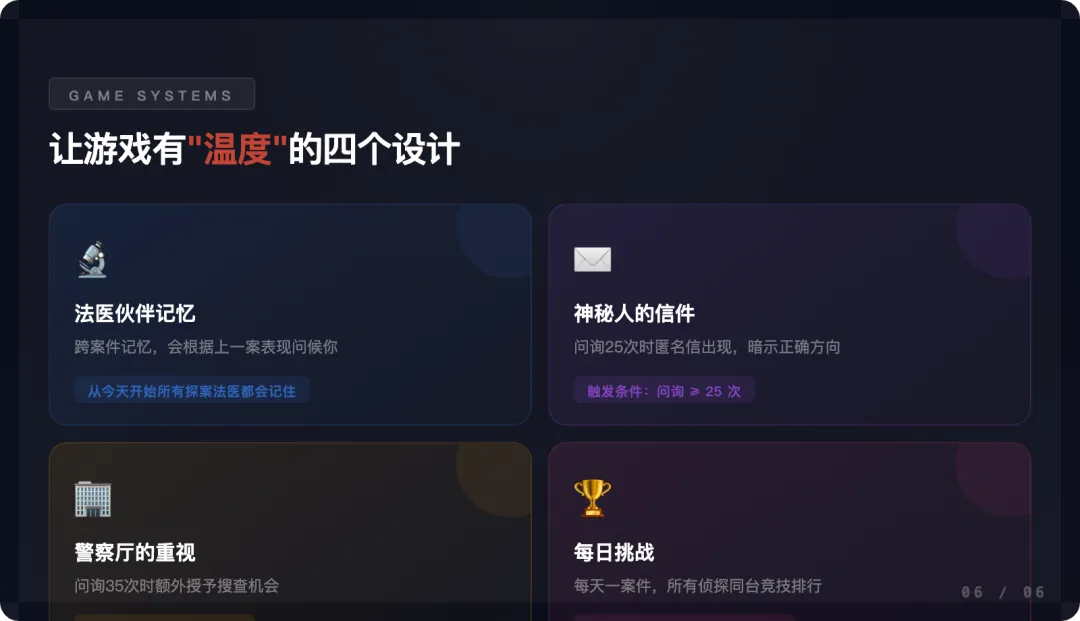 如果故事到这里结束,它只是一个 Demo。但一个推理迷不会满足于”能玩”——他要的是”上瘾”。