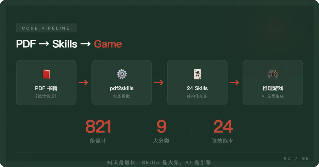 PDF → Skills → App。这是一条通用管线。