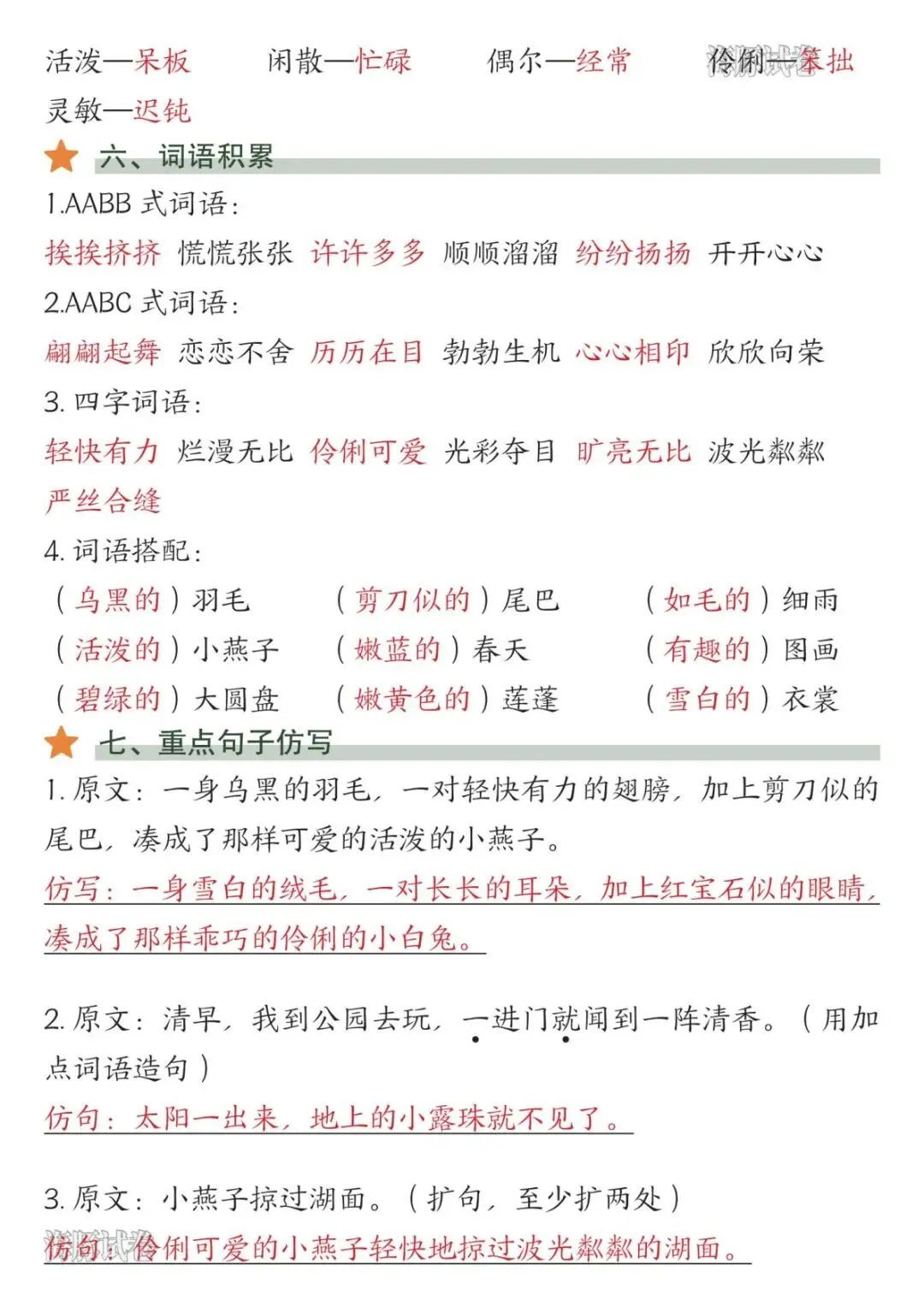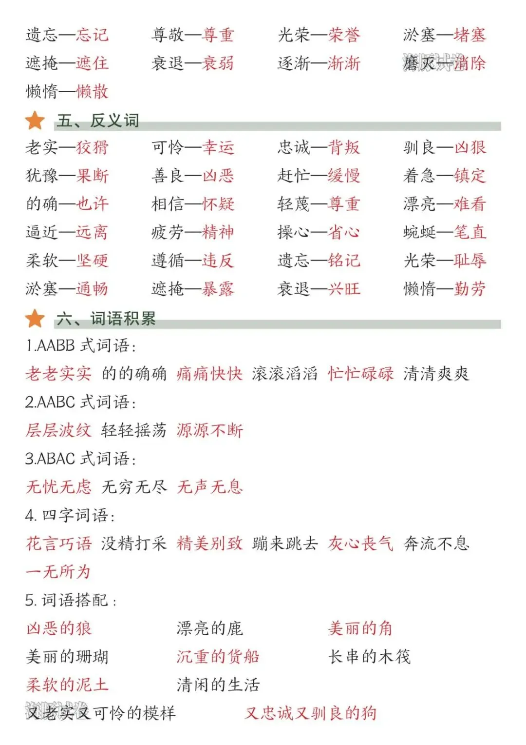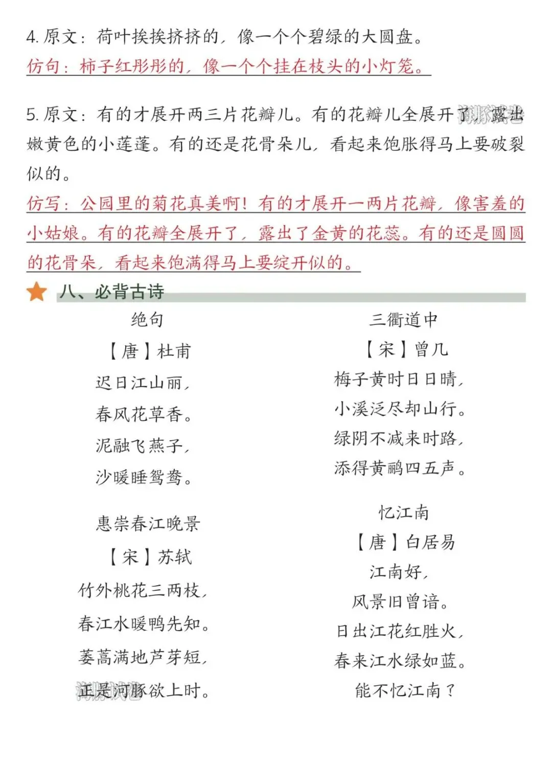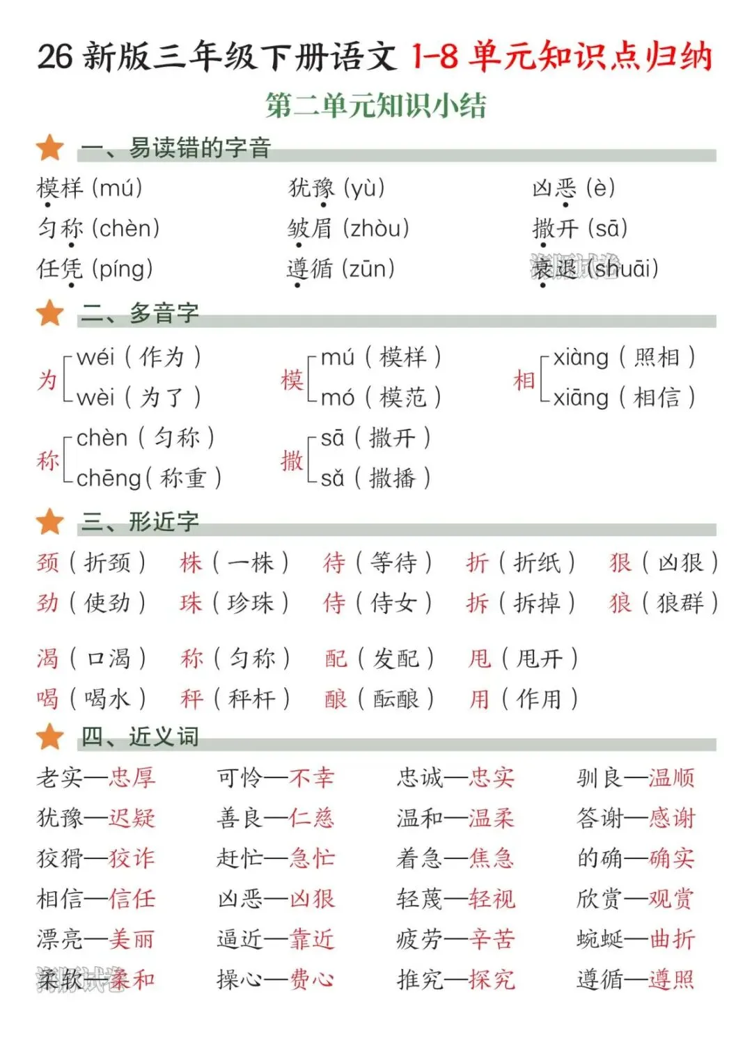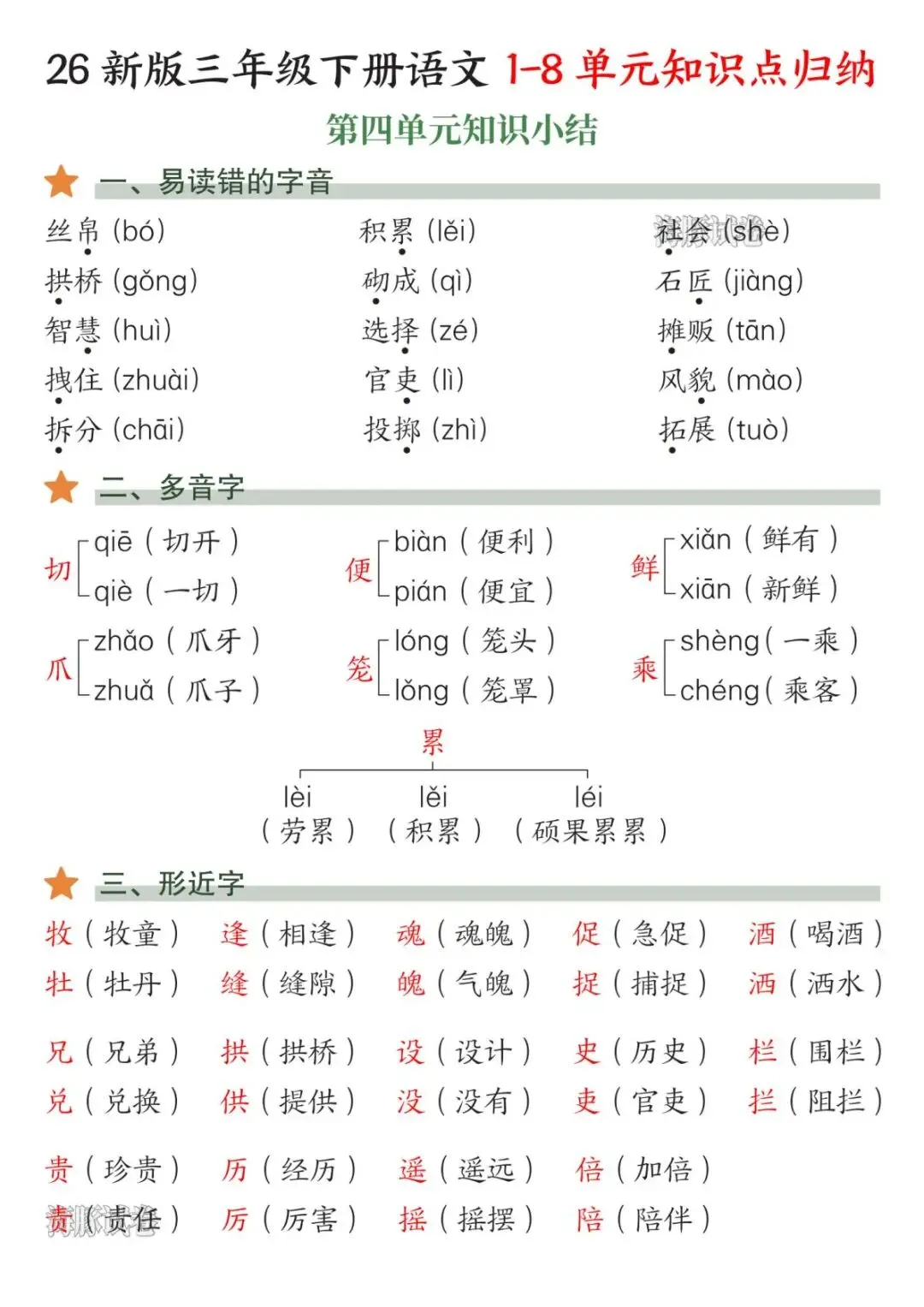 2026年春新版人教部编版三年级下册语文《1-8单元知识点总结》,电子版可下载打印。该三年级语文1-8单元知识点总结包括易读错的字、多音字、词语听写、近反义词、词语搭配、句子仿写等内容,有需要的老师家长快给孩子们打印学习吧。