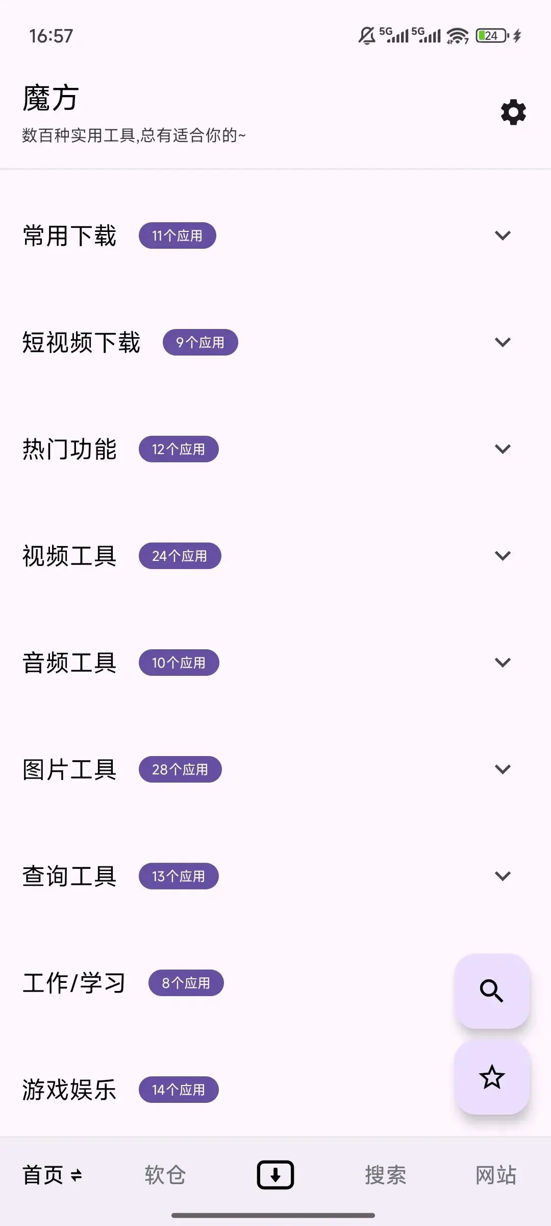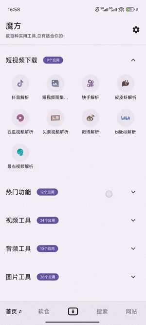 这是一款包含了超级多工具的神器,内置数百种实用工具,类型颇多,有下载工具、短视频工具、游戏娱乐等等,还有找资源、搜软件这些强大的功能,一个工具软件直接顶上百个。