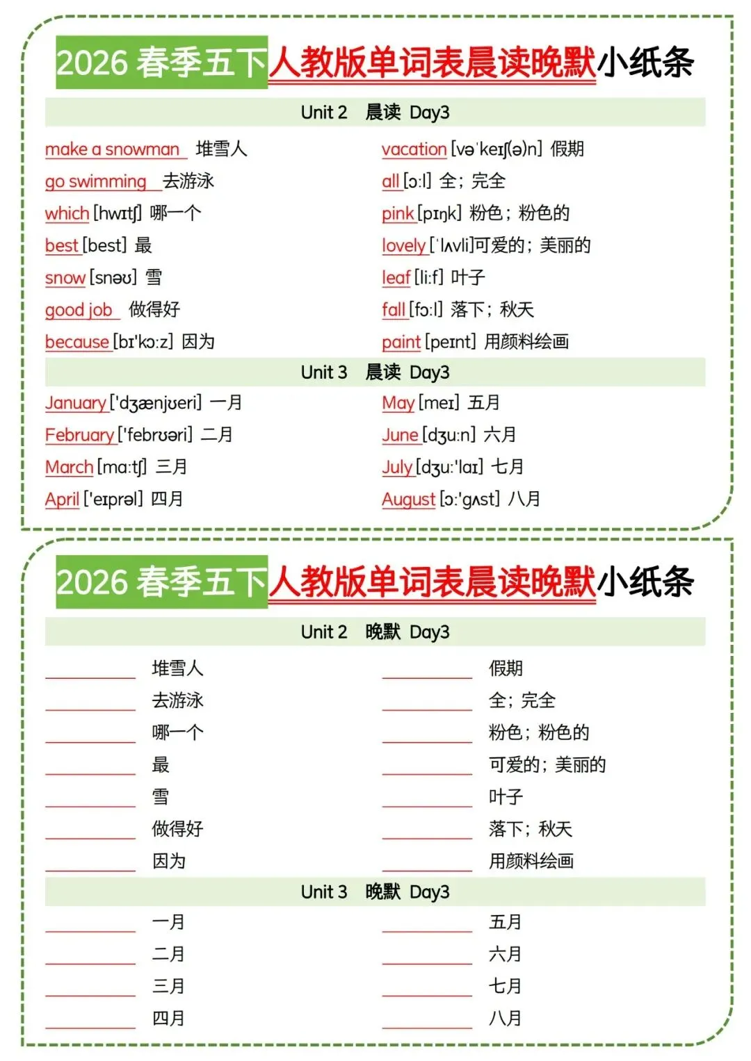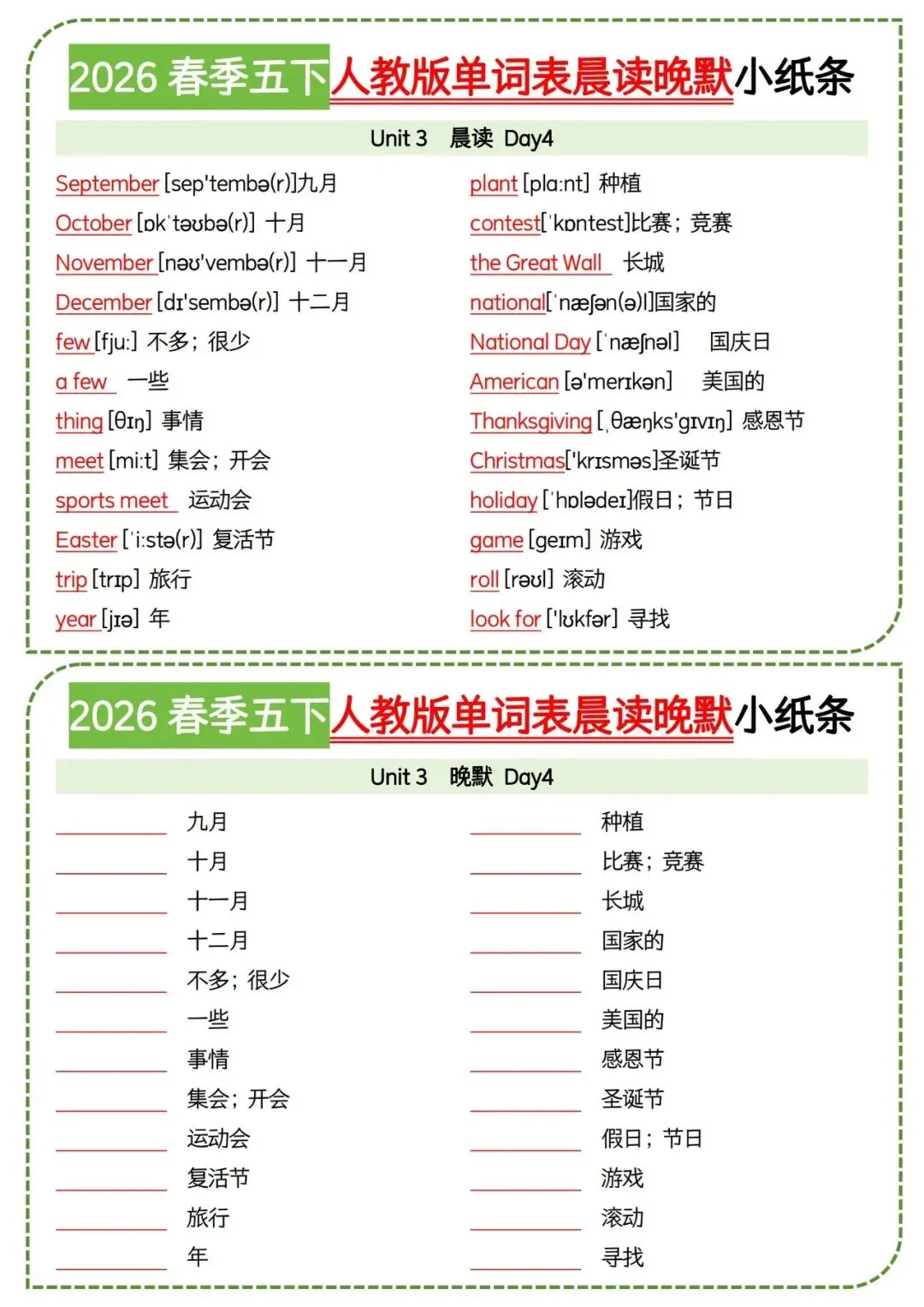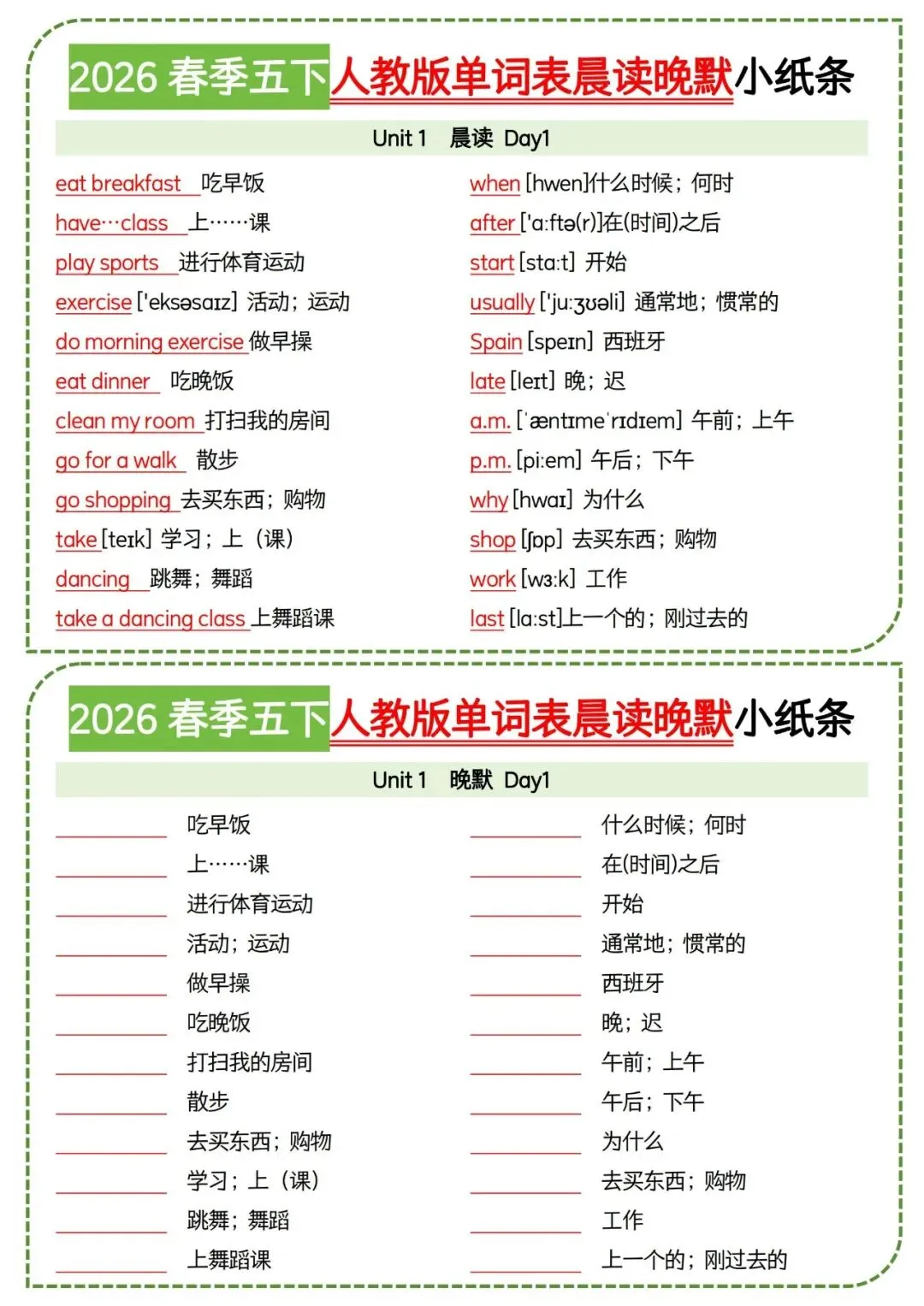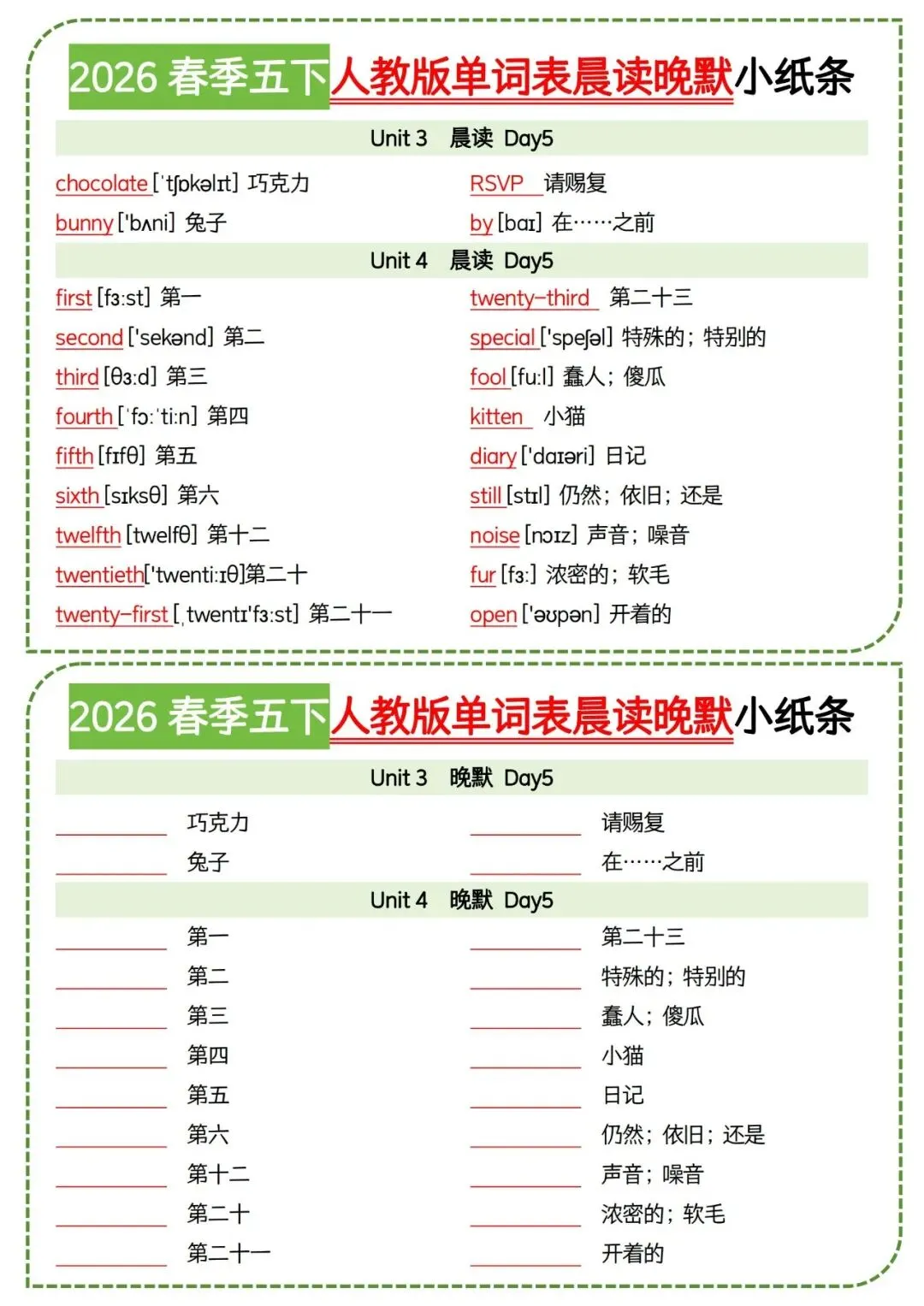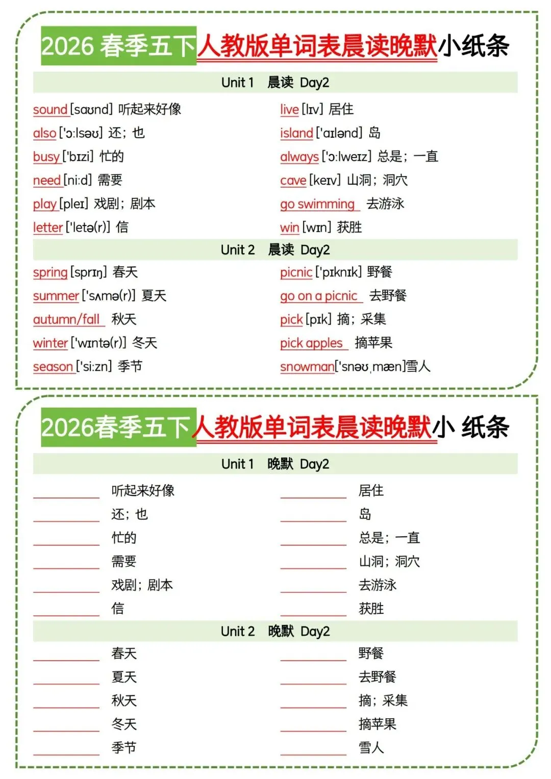 🌸2026年春五年级下册英语人教PEP版《英语单词晨读晚默》小纸条含答案解析,完整电子版可打印。