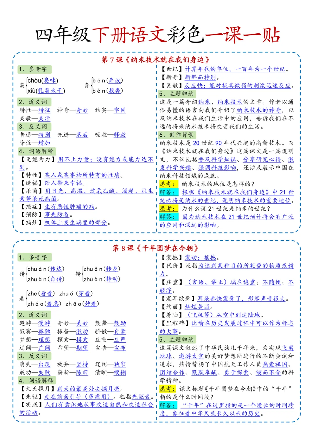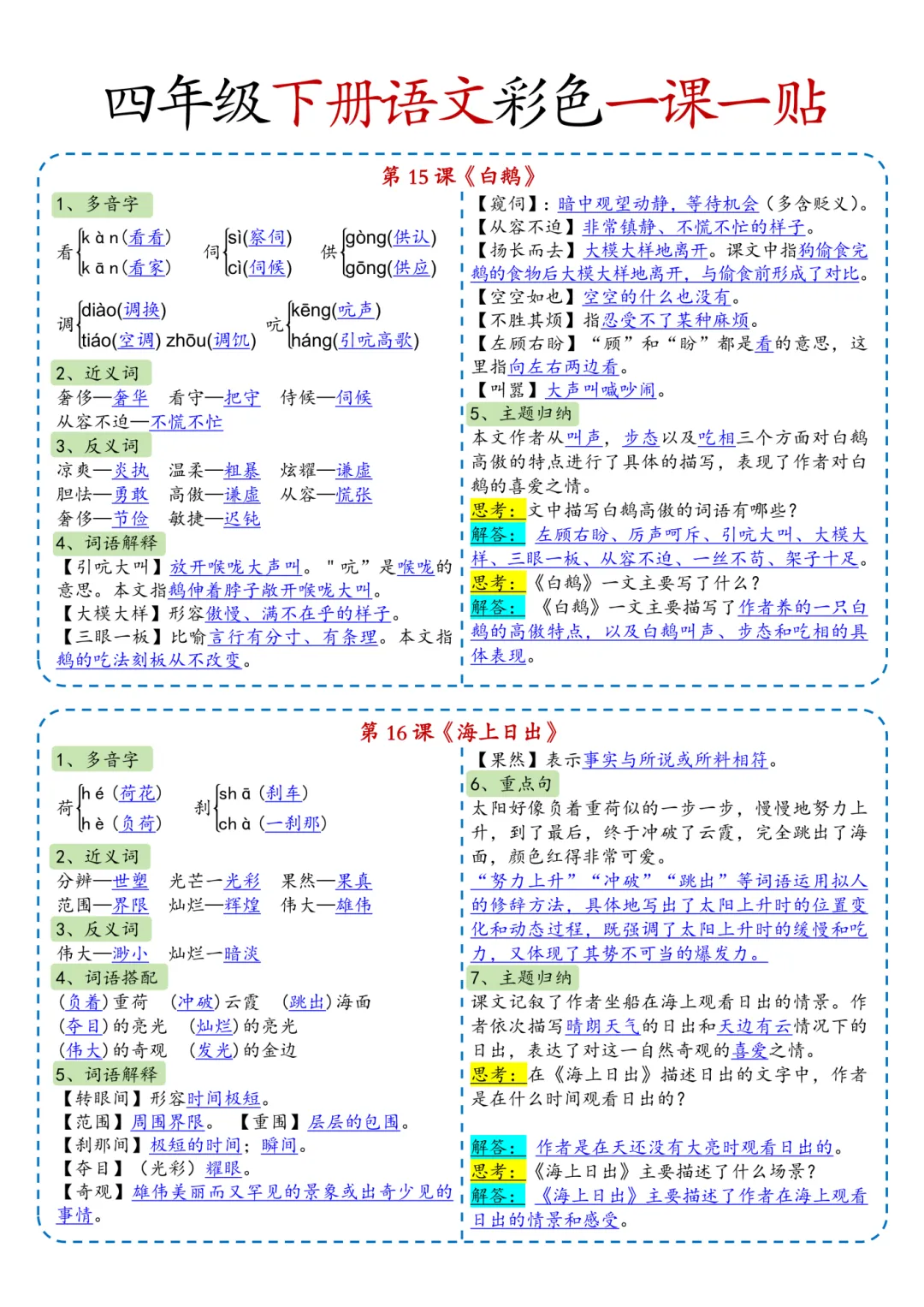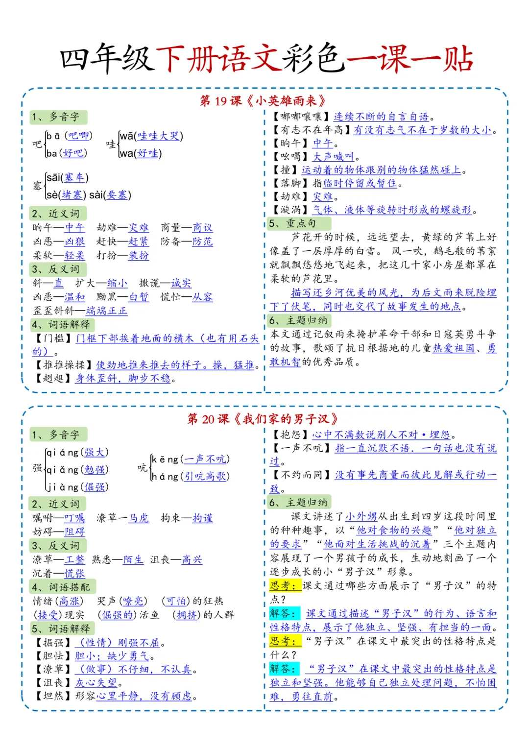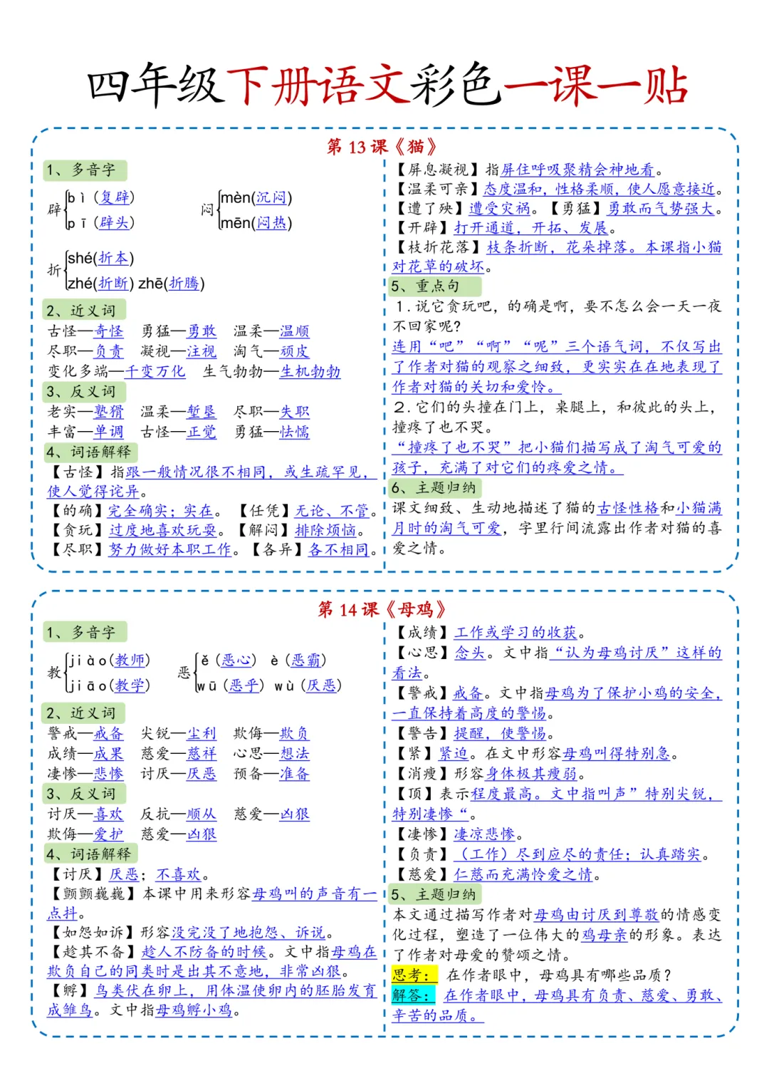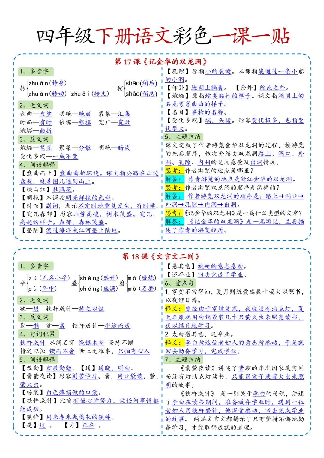 四年级(下)语文彩色一课一贴(课课贴)可打印!