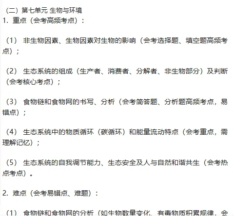 2. 掌握第七单元核心知识:理解非生物因素、生物因素对生物的影响,明确生物与环境的适应与相互作用;掌握生态系统的组成、类型、食物链和食物网的书写规则,理解生态系统中物质循环和能量流动的特点;了解生态系统的自我调节能力、生态安全的重要性,掌握人与自然和谐共生的相关理念,熟记会考必背知识点。