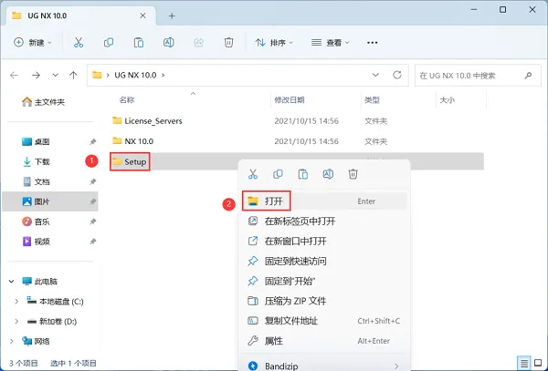 6、回到UG NX 10.0文件夹,找到【Setup】文件夹,右键【打开】它。