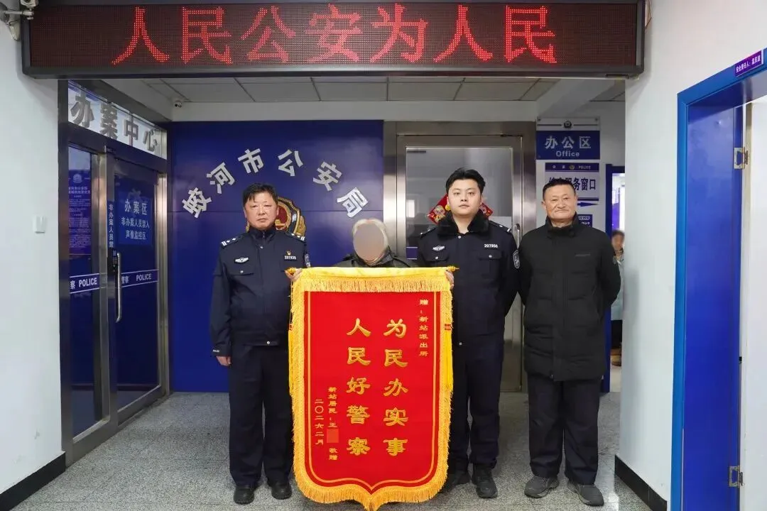 春节期间,年过七旬的王大娘专程来到新站派出所,将一面印有“为民办实事,人民好警察”的鲜红锦旗送到民警孟庆波、佟星芯手中,对派出所倾力相助、解决其家庭困境表示深切感谢。