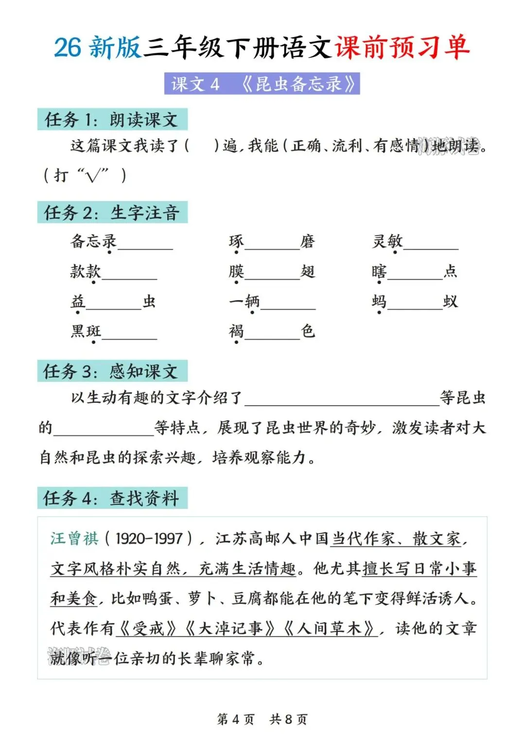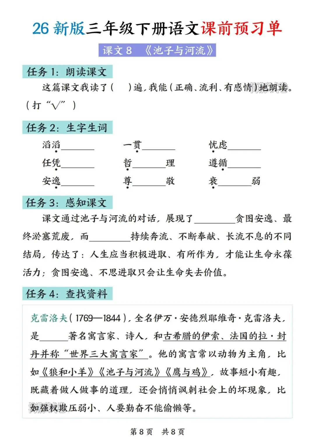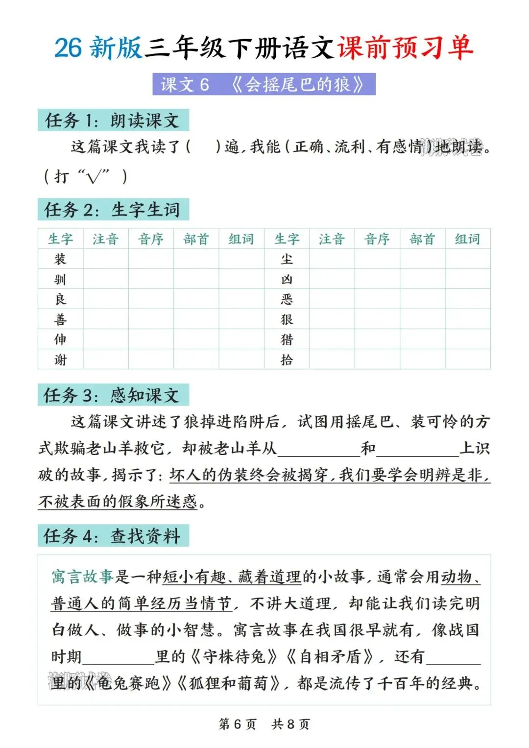 26新版三年级下册语文(课前预习单)电子版 可打印