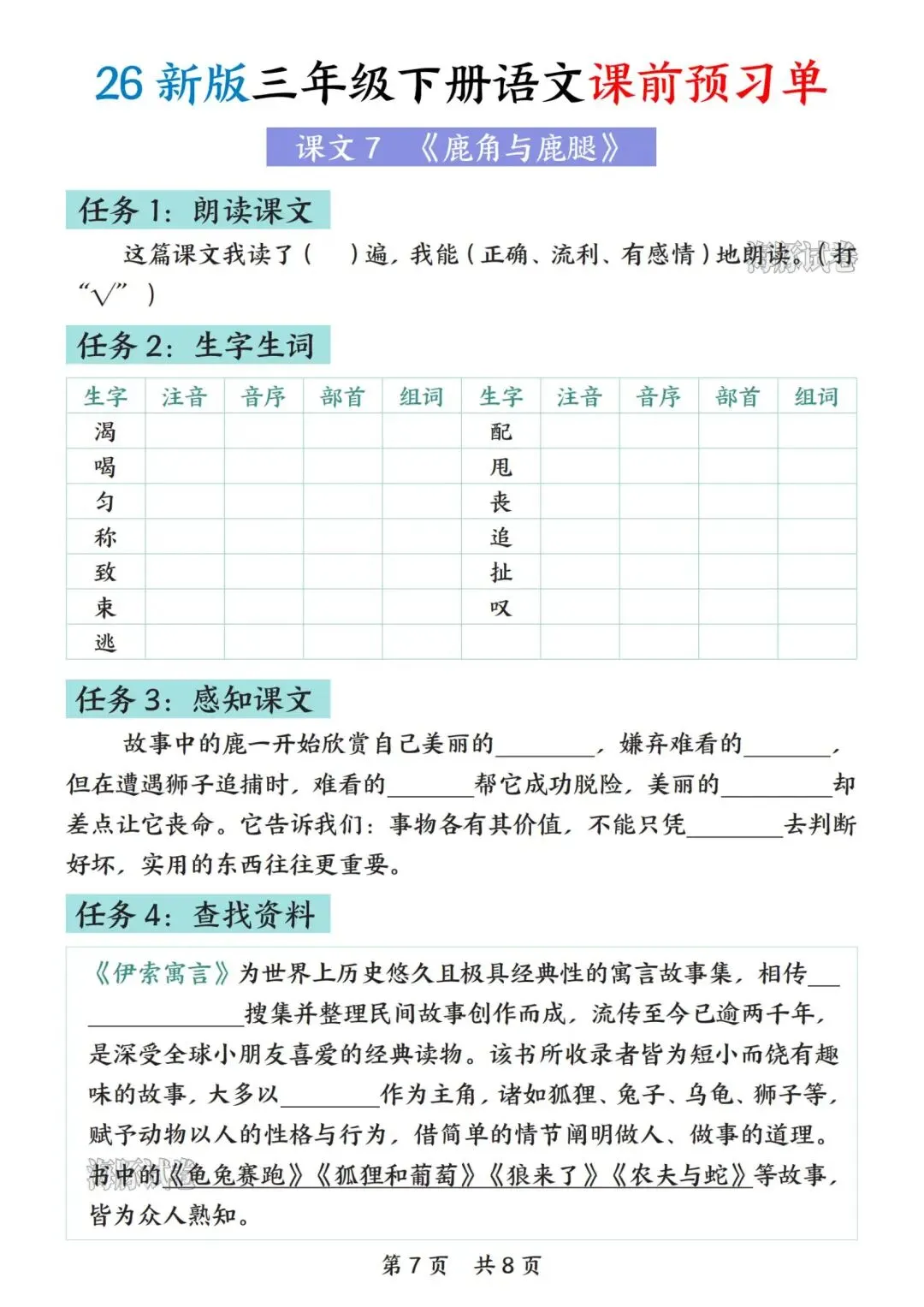 学校刚发的,26新版三年级下册语文《课前预习单》,共9页可打印,这份三年级下册语文预习单,有每课任务包含朗读课文、生字生词、感知课文等,家长看文末领取方式,给孩子打印出来,帮助孩子课前预习巩固!