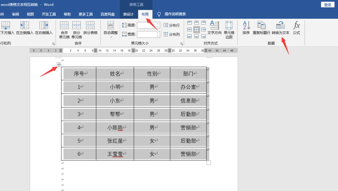 然后,在菜单栏中选择“布局”选项,并在下拉菜单中找到并点击“表格转文本”按钮。