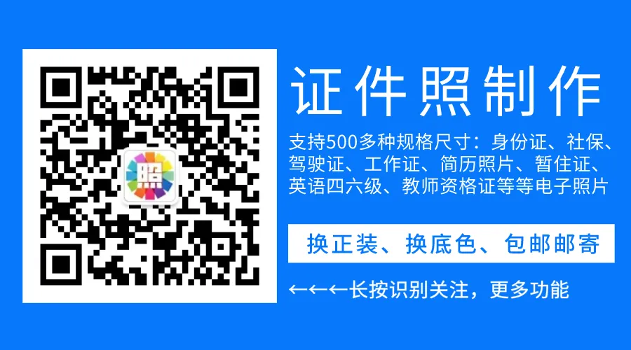 识别关注上方二维码进入拍摄,支持500多种规格尺寸照片:身份证,驾驶证,英语四六级考试照片,教师资格证等电子照片