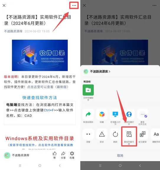 手机端查找方法:在微信内打开本篇文章>>点击右上角的三点>>点击查找页面内容>>输入软件名称,如:CAD