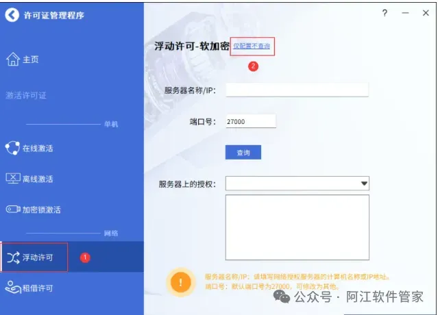 点击左侧【浮动许可】,再点击【仅配置不查询】