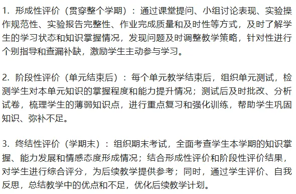 本学期将采用形成性评价、阶段性评价和终结性评价相结合的方式,全面、客观评价学生的学习情况和教师的教学效果,注重评价的激励性和指导性,促进学生自主学习和教师教学优化。