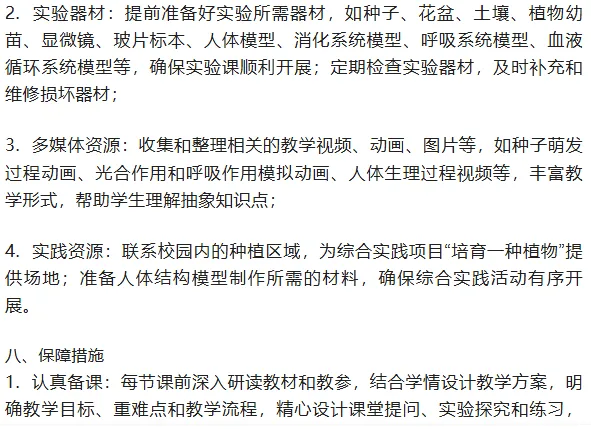 1. 教学资料:认真研读七年级下册生物新教材、教学参考书,撰写规范的教案,制作贴合教学内容、直观生动的课件,收集相关的教学练习题、测试卷和拓展性学习资料;