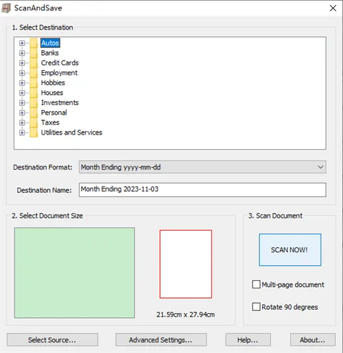 ScanAndSave是面向Windows的资料扫描与组织管理软件,几步就能轻松扫描各类单据、文件,帮你高效处理每月报表、收据、作废支票等重要文档,还能对扫描页面进行管理,支持多页或分开扫描,并为每页添加说明。