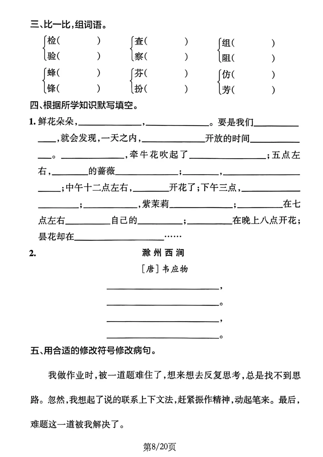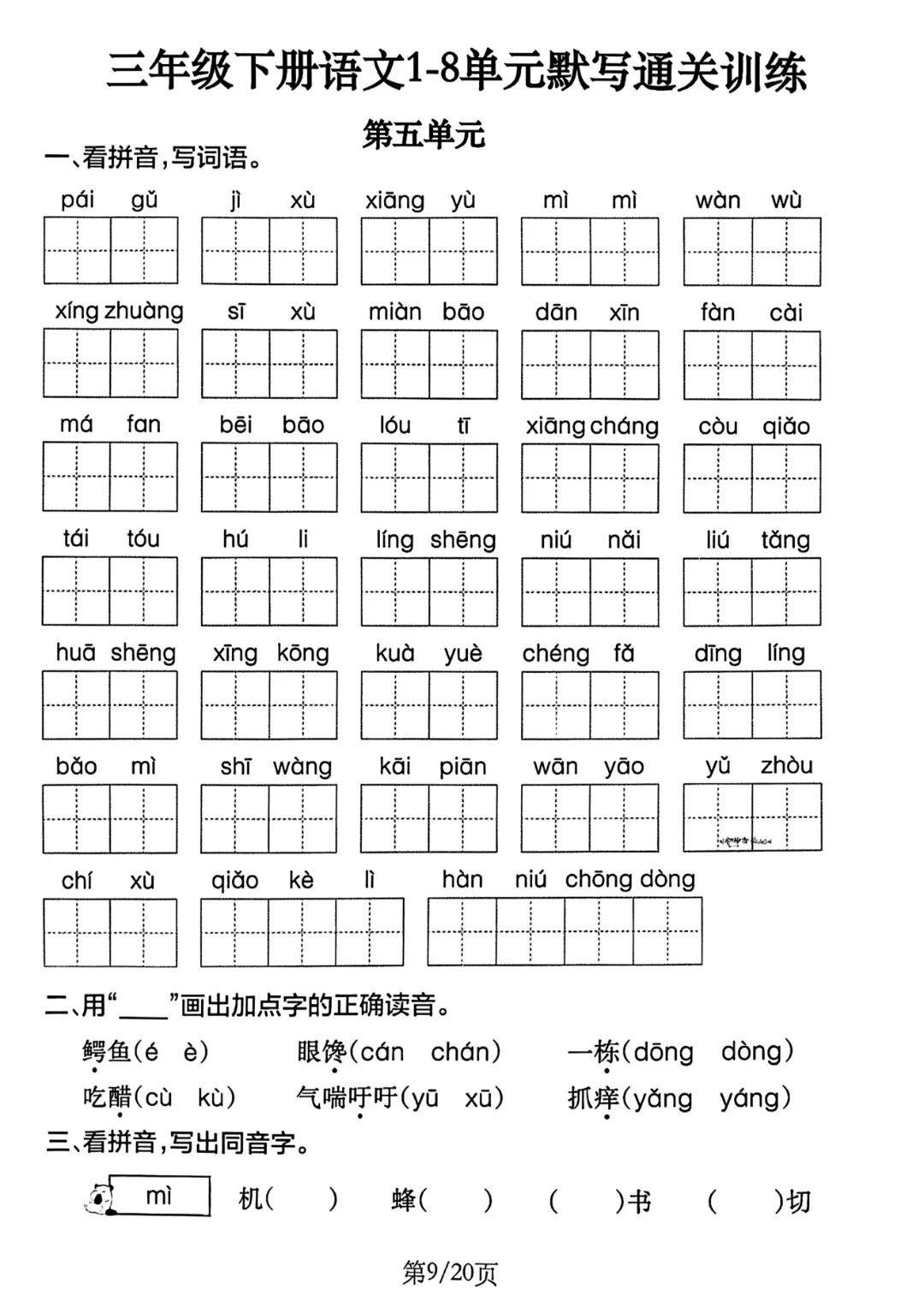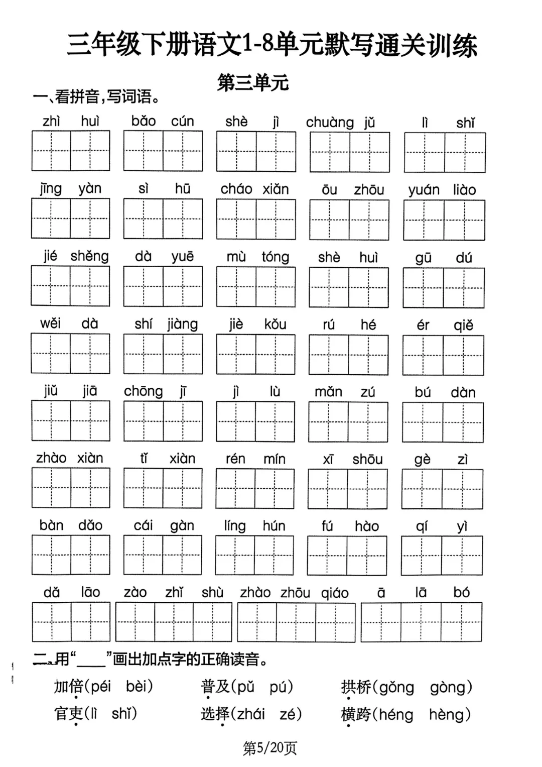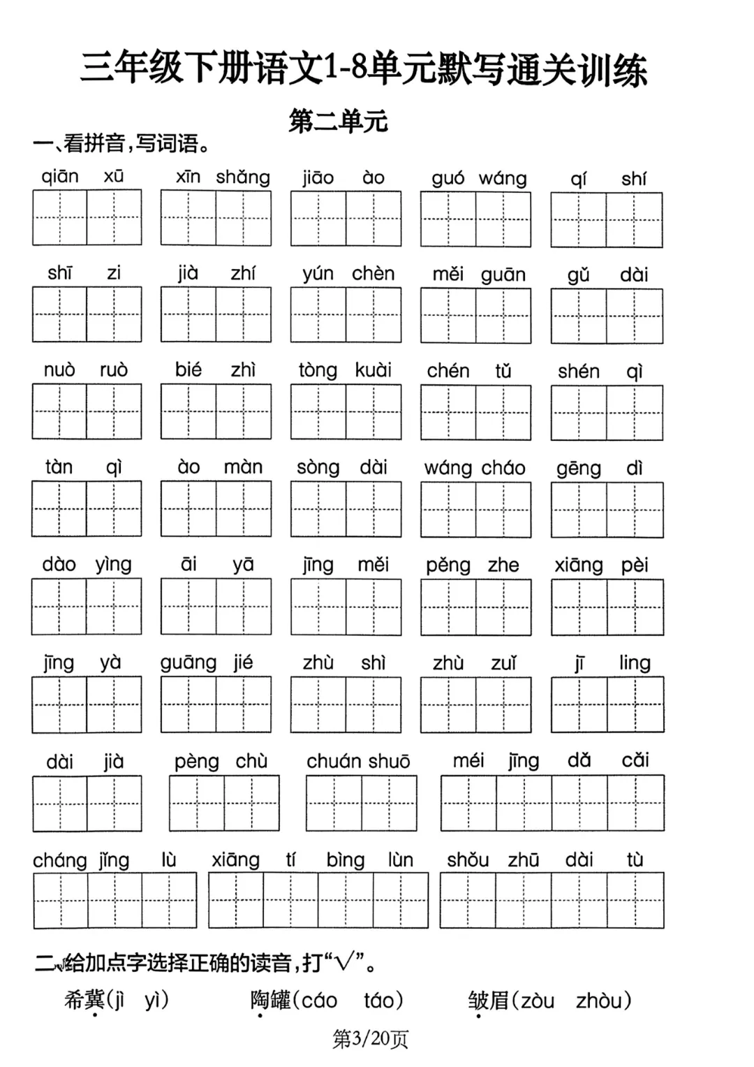 紧扣三年级下册语文全册8个单元的学习重点,这份默写通关训练将字词基础与课文核心深度融合。从看拼音写词语、多音字辨析等基础题型,到课文重点段落、古诗词全文默写等进阶内容,层层递进覆盖全册考点,精准锁定孩子易丢分的关键环节,助力扎实筑牢语文根基,高效攻克单元默写难关。