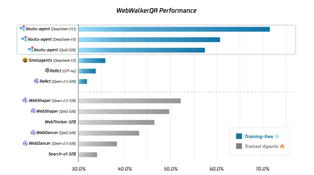 很多人可能会怀疑:不用GPT这些闭源模型,能行吗?Youtu-Agent用数据说话,在WebWalkerQA测试里,它的准确率达到了71.47%,GAIA文本子集测试也有72.8%的得分。