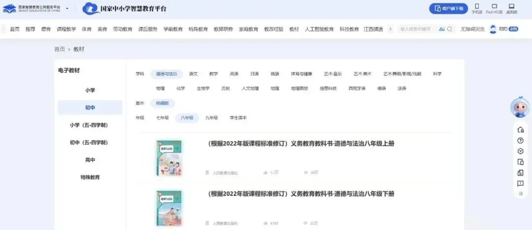 3月1日,国家中小学智慧教育平台更新了2026年春季开学使用的最新版电子课本。