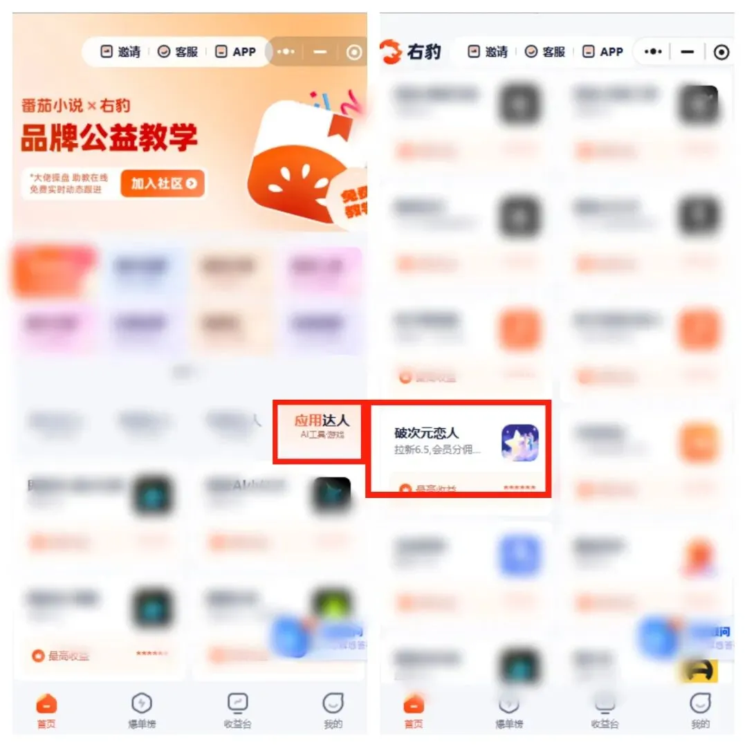 启动右豹APP或小程序,进入“应用达人”中的“破次元恋人”项目页面。