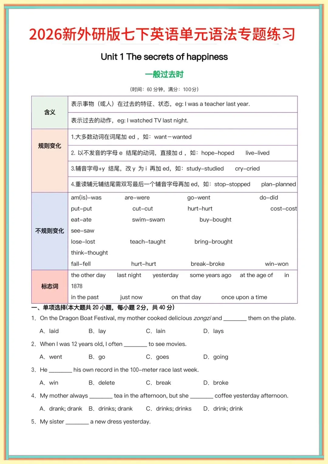今日分享:2026新外研版七年级下册英语全册单元语法专题练习+一课一练(原卷+答案),完整电子版可下载打印!