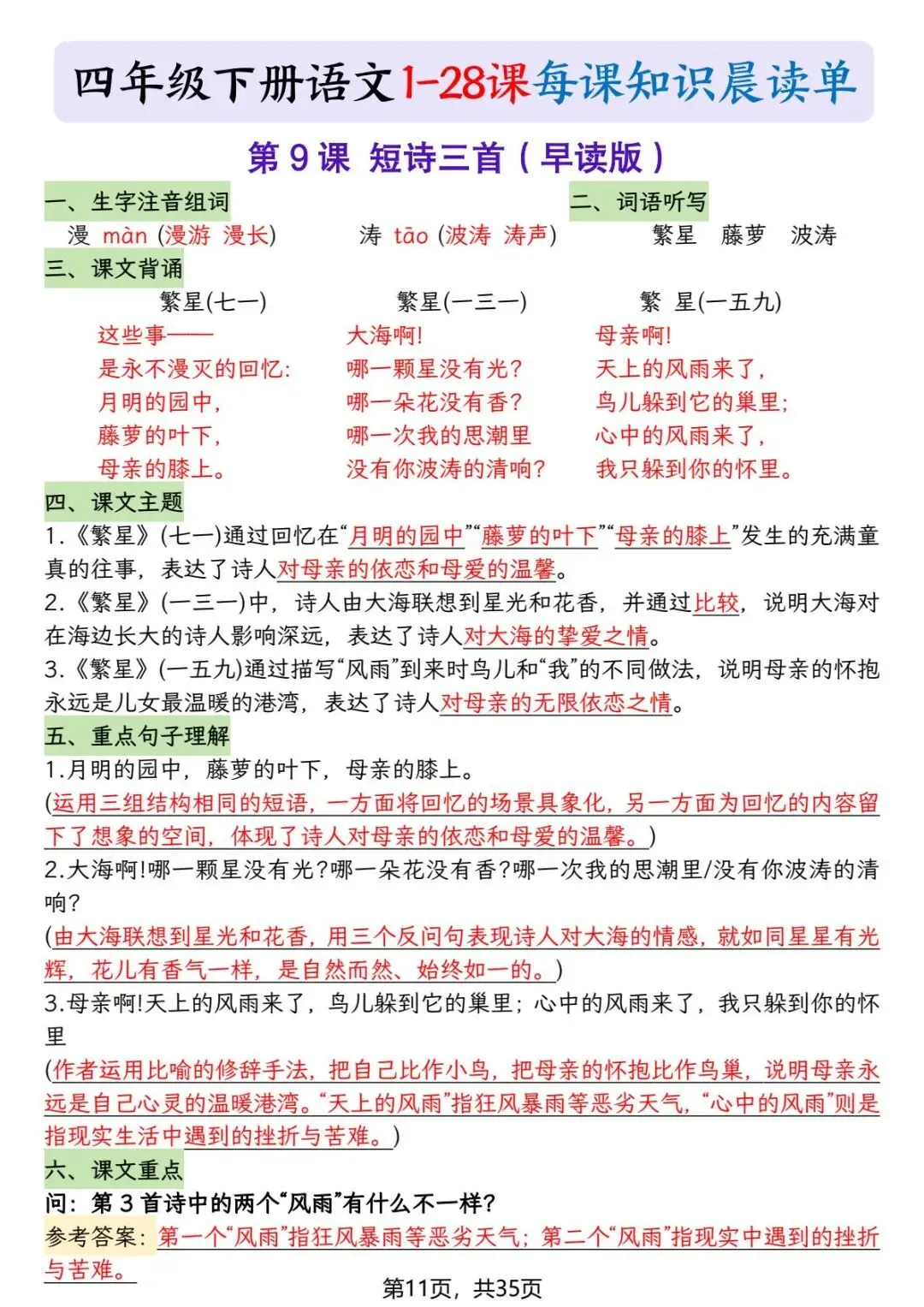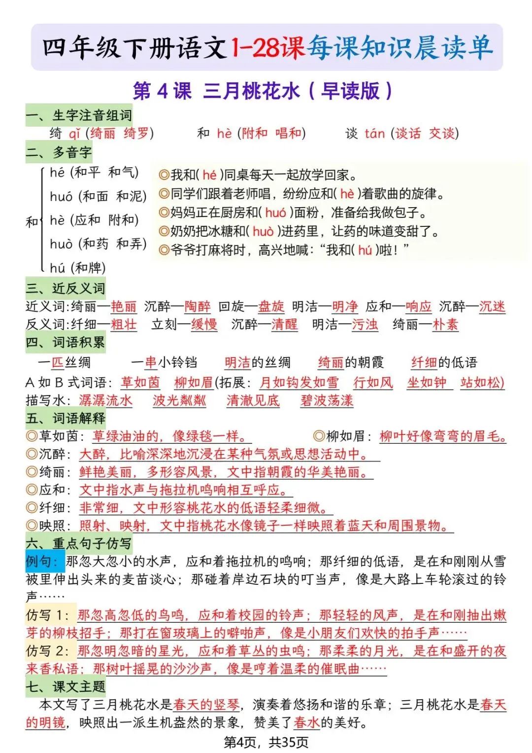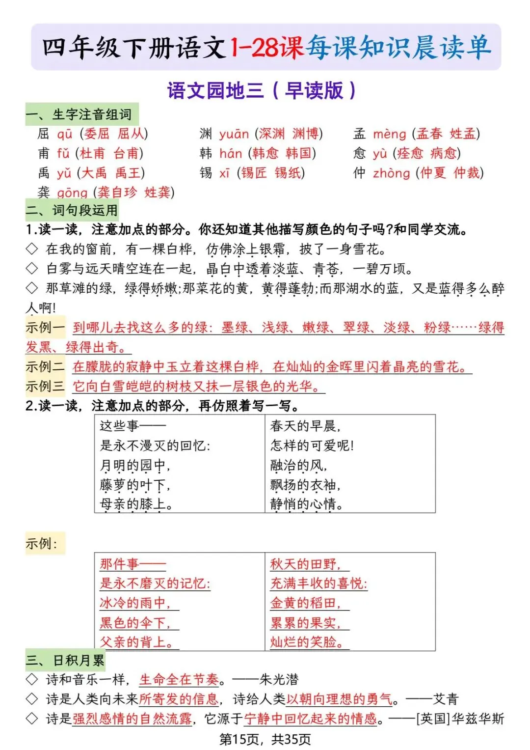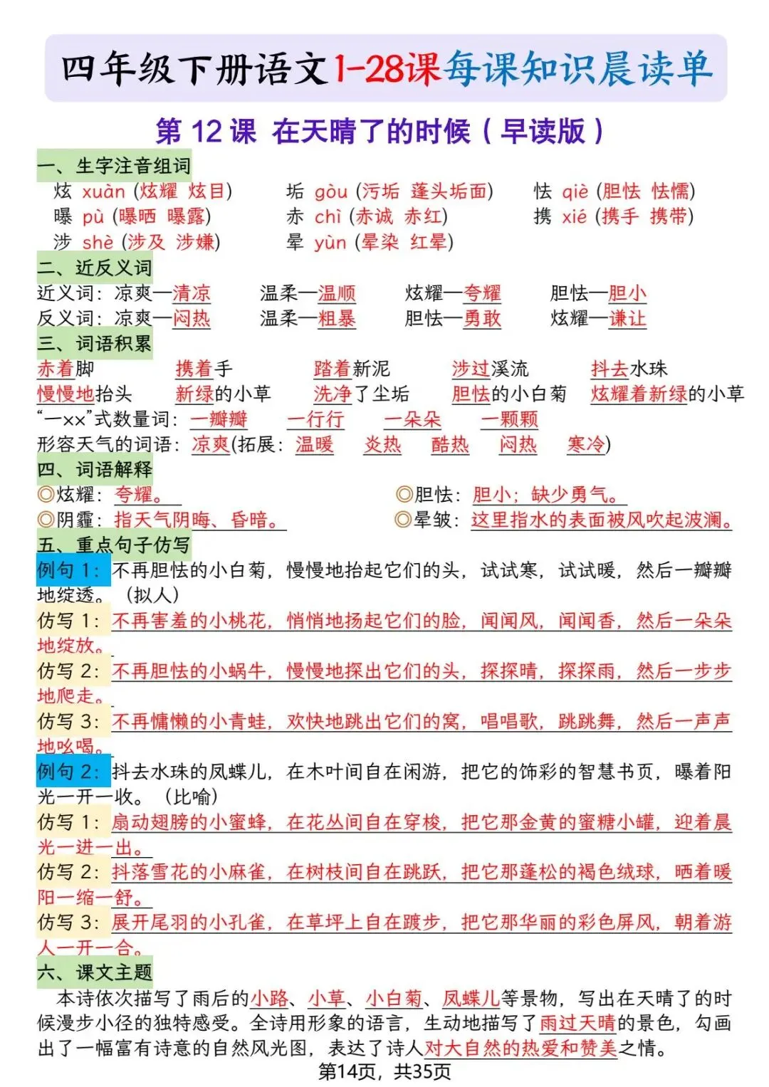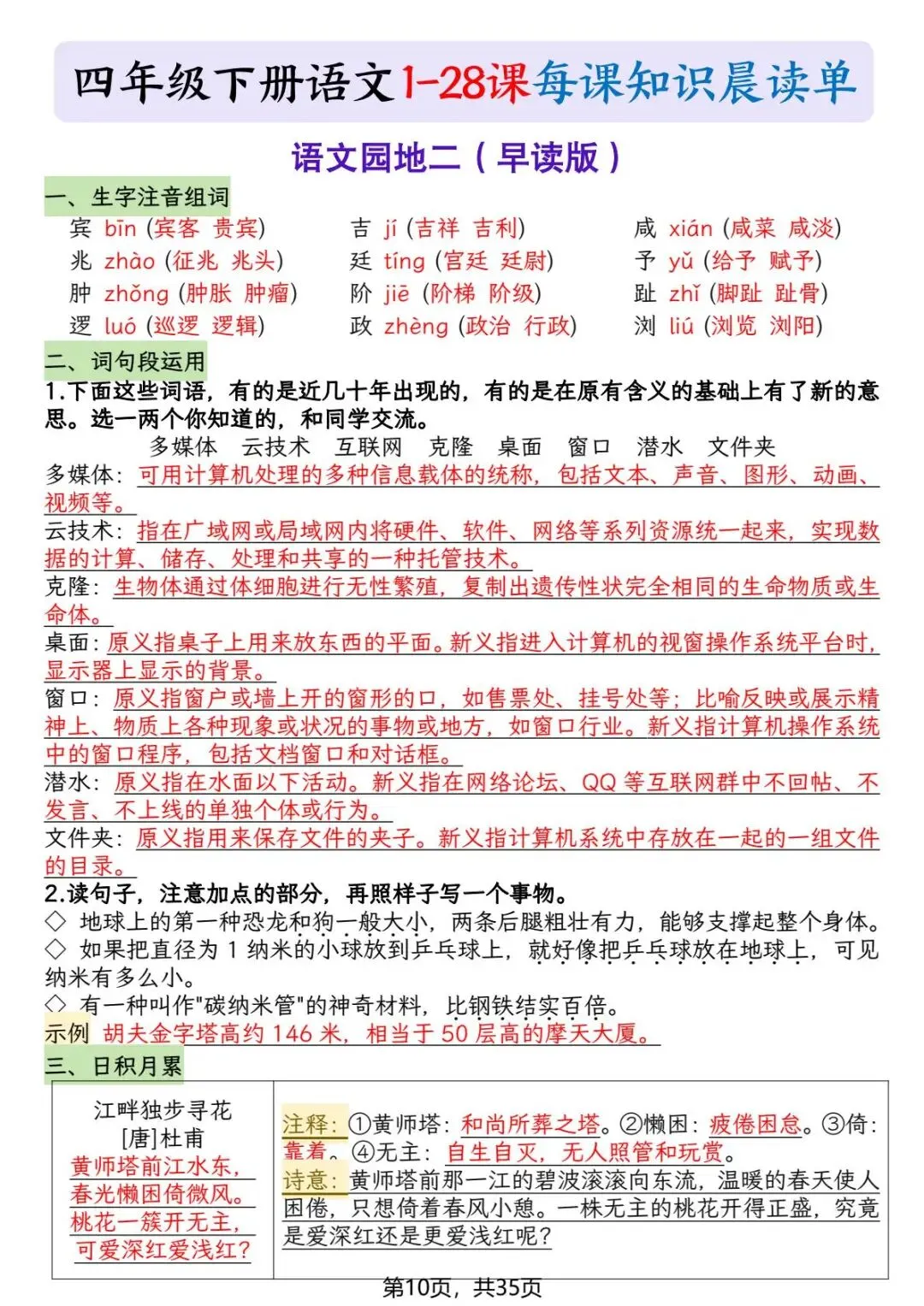 2026年春人教部编版四年级下册语文《1-28课每课知识晨读单》,可下载打印