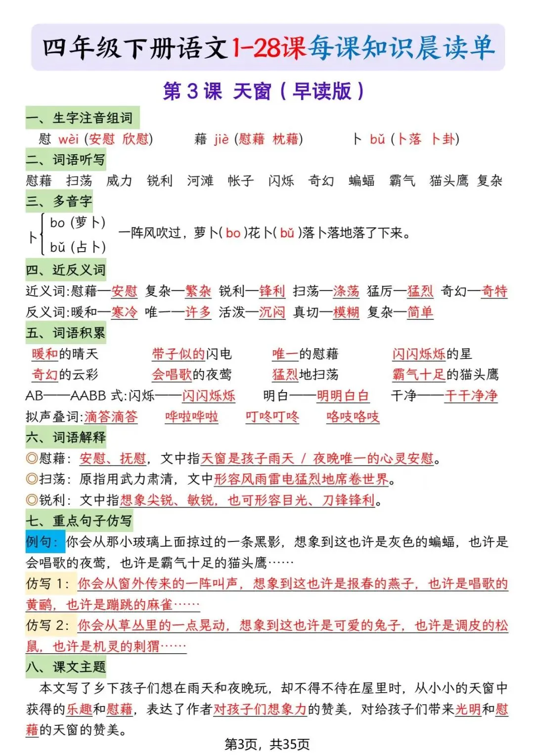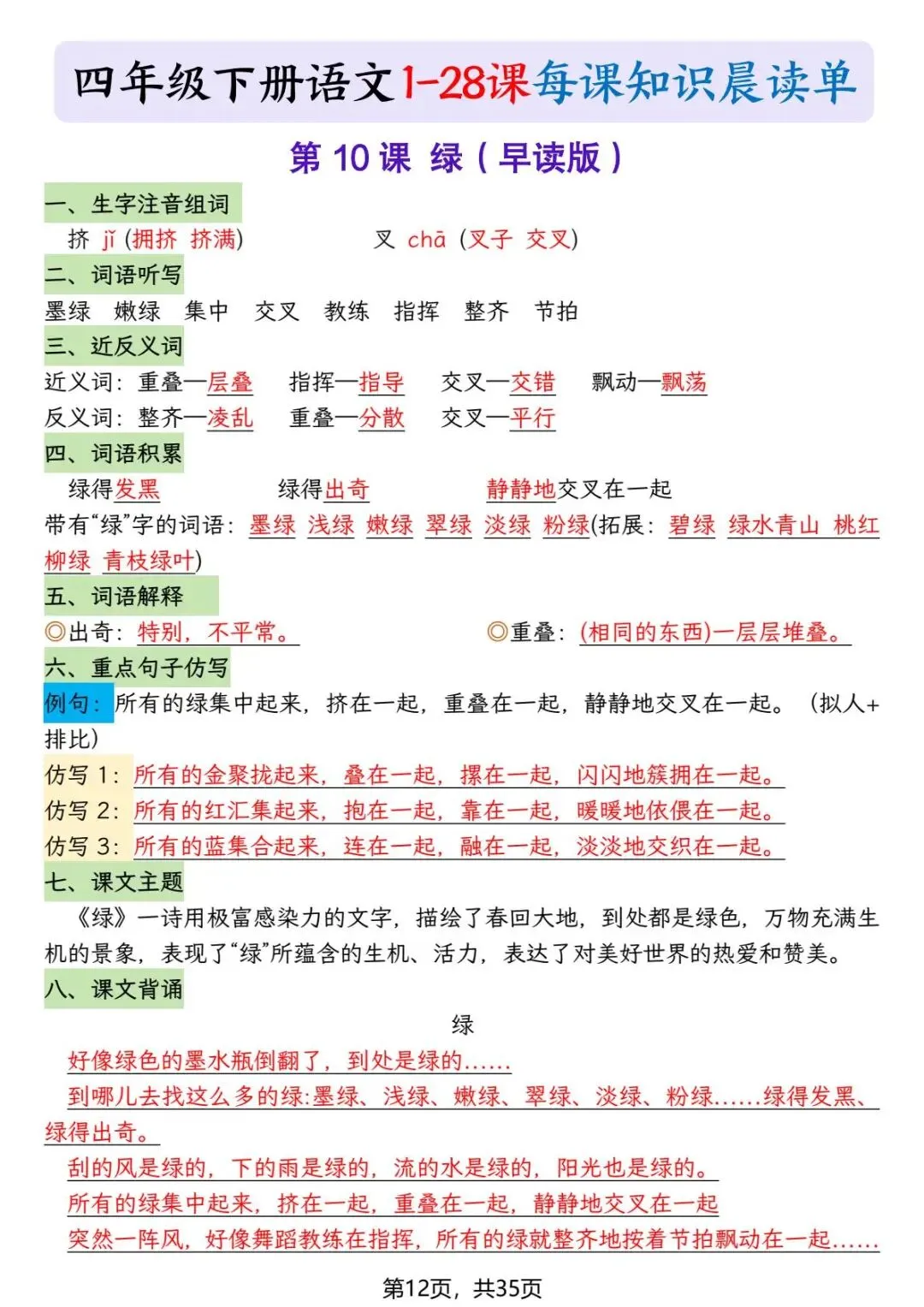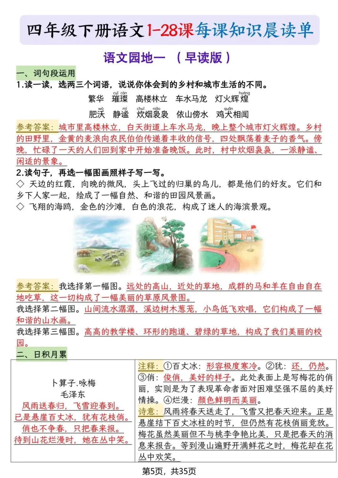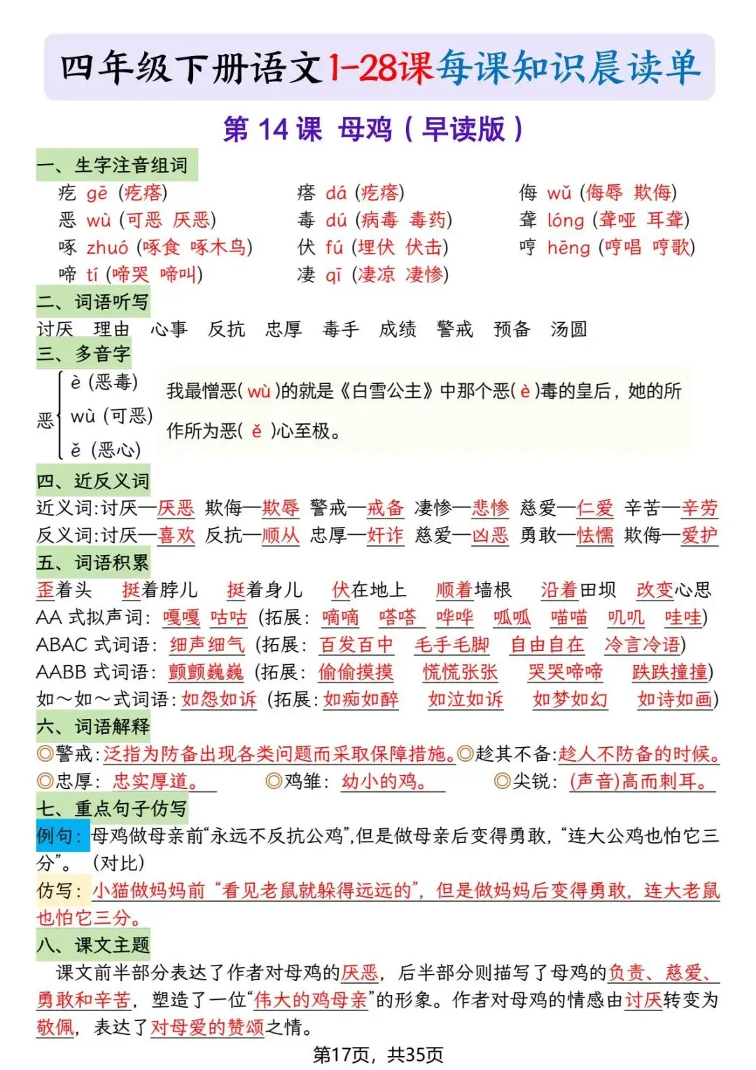 2026年春人教部编版四年级下册语文《1-28课每课知识晨读单》,可下载打印