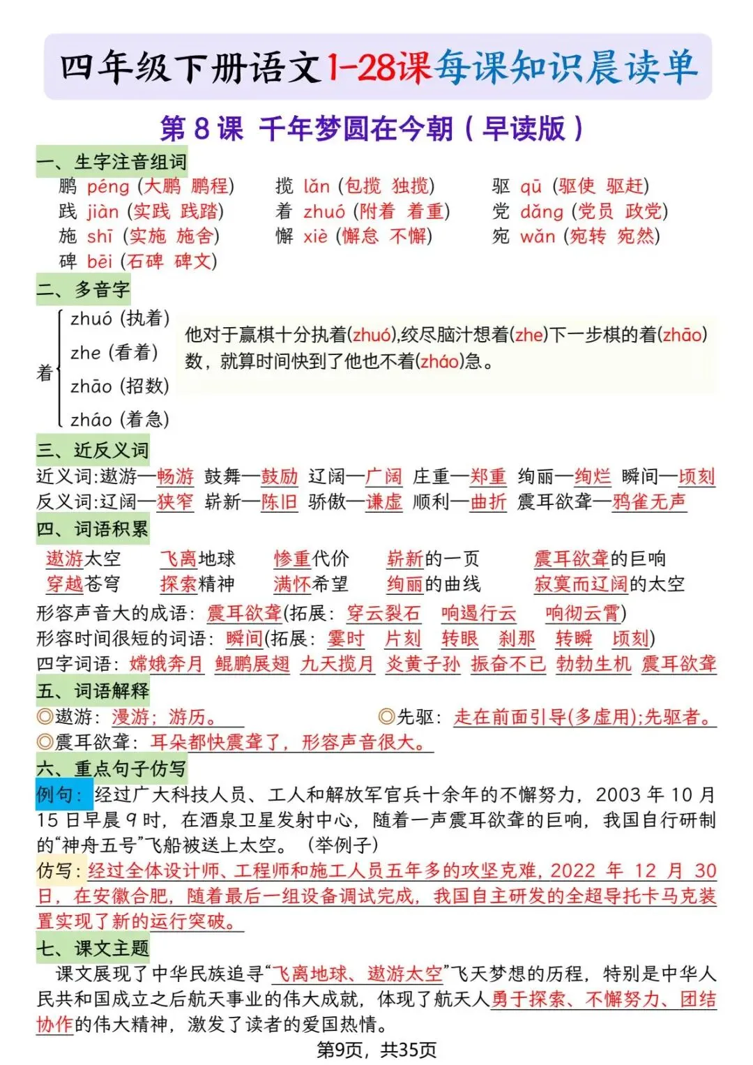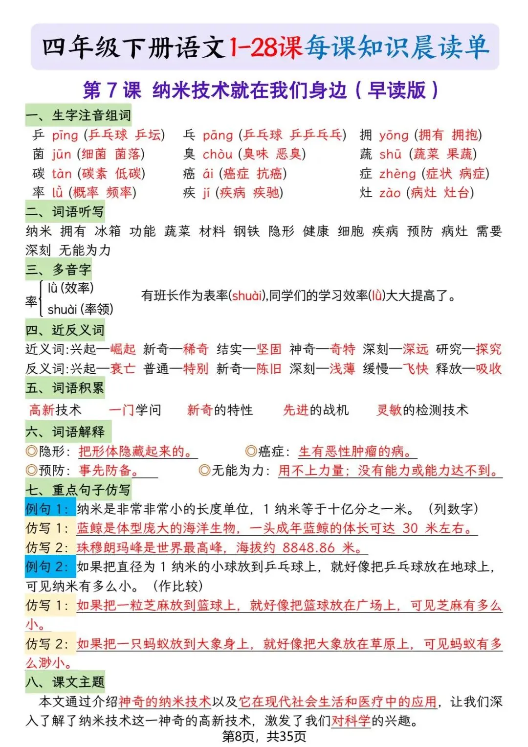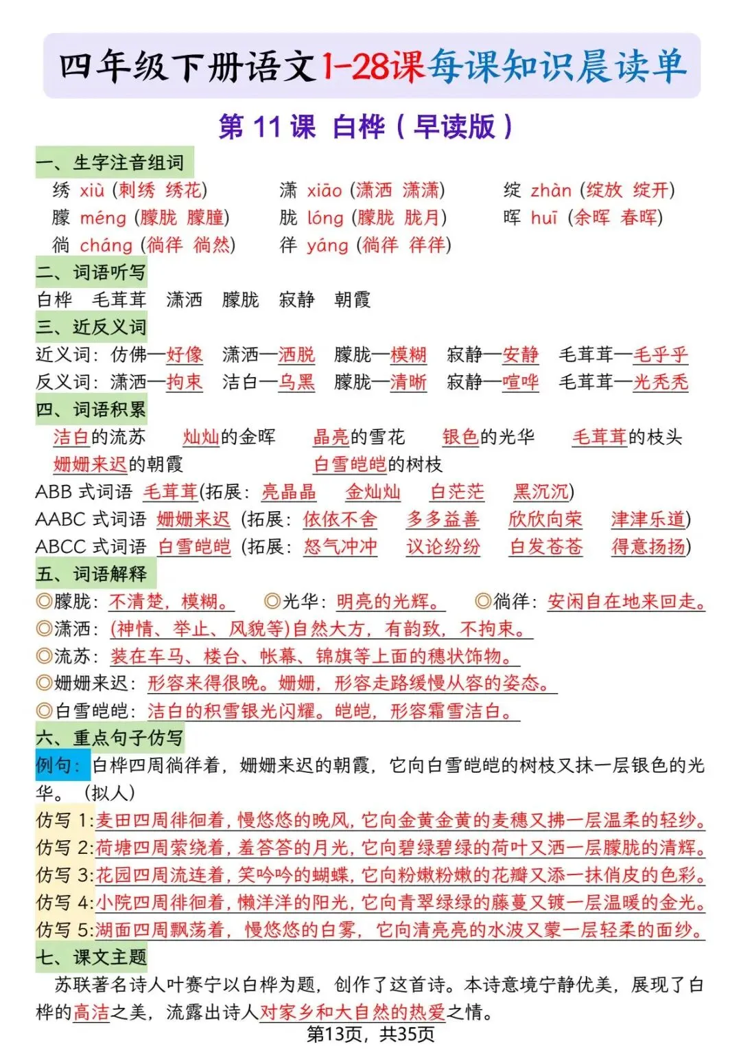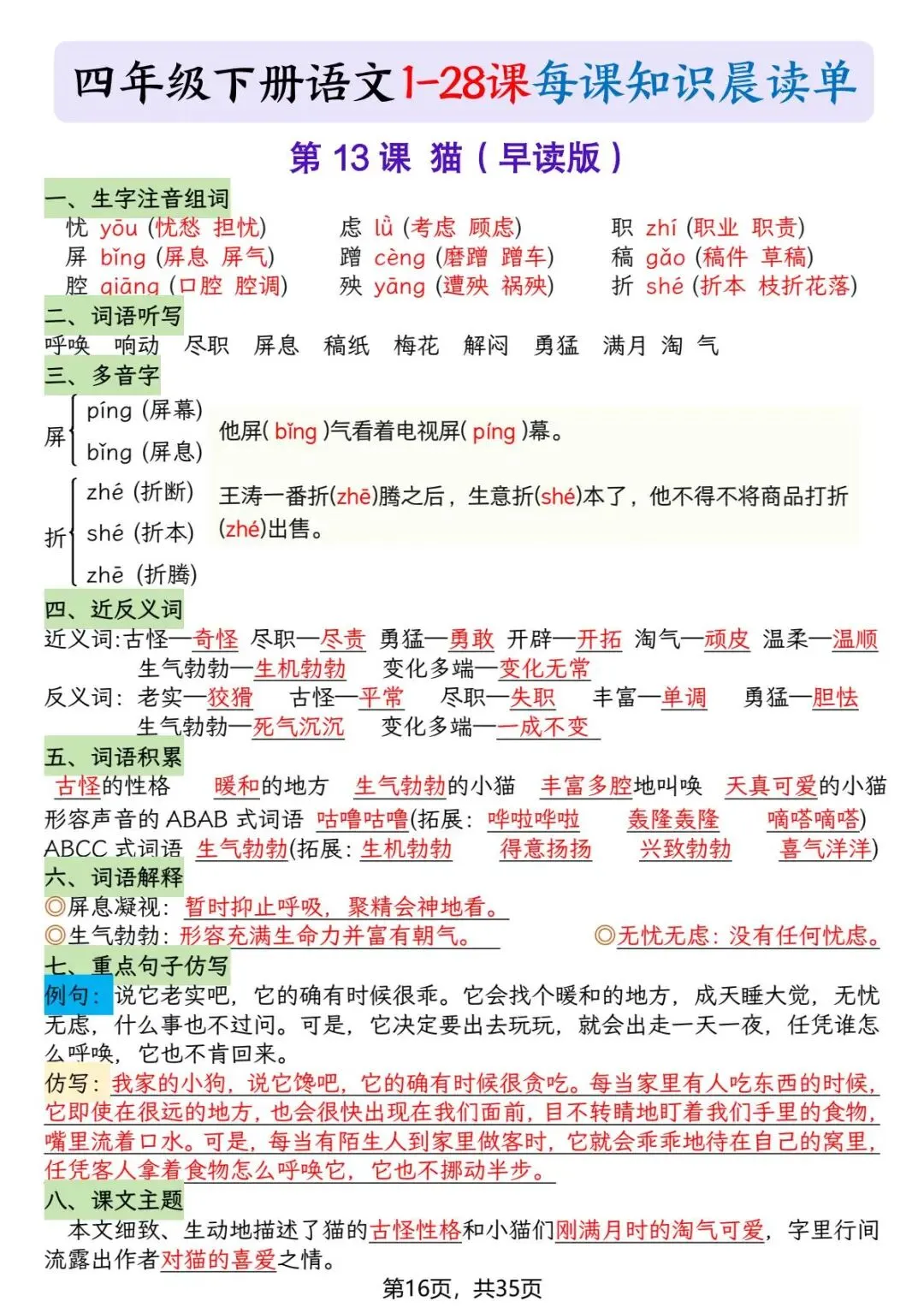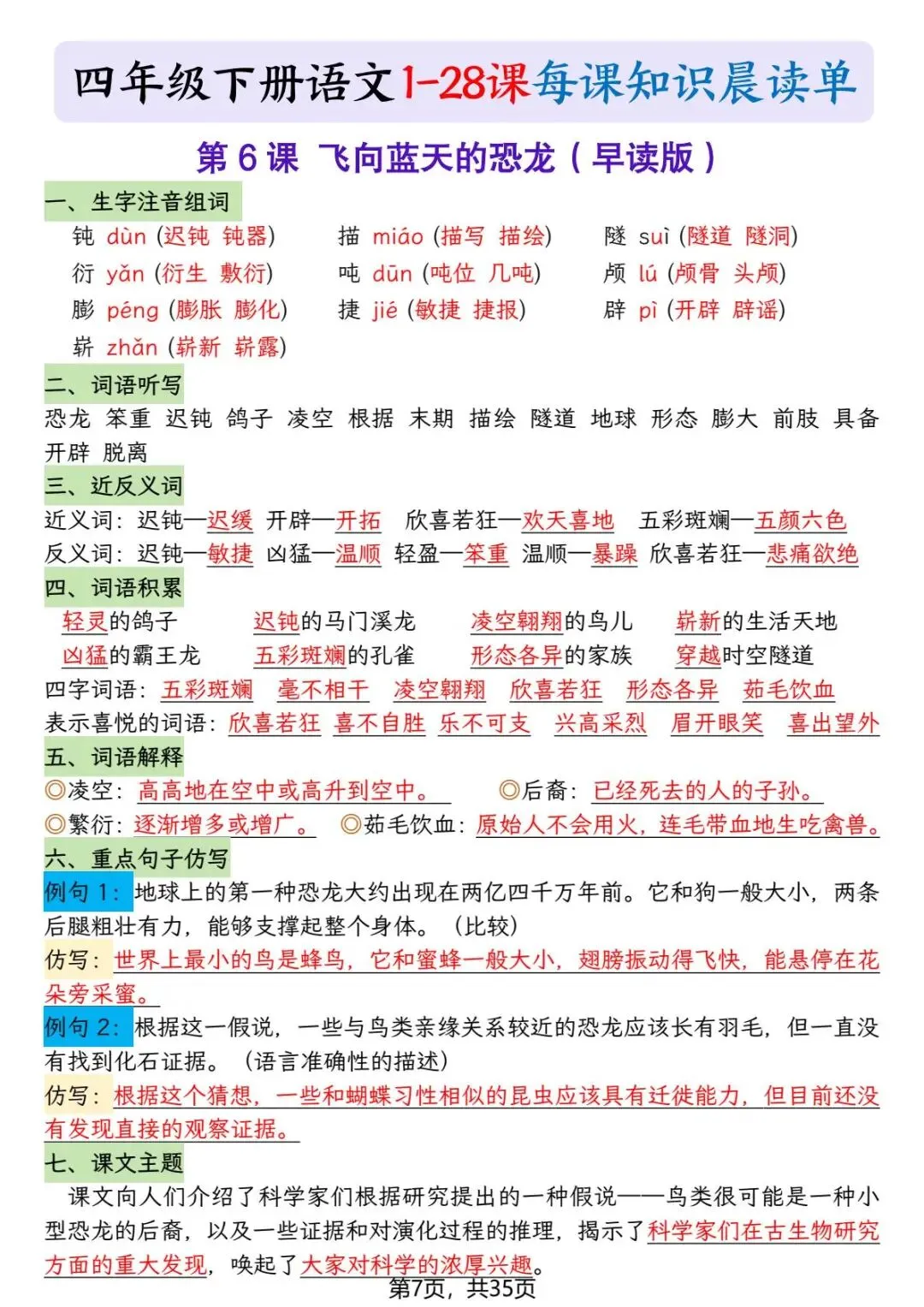 2026年春人教部编版四年级下册语文《1-28课每课知识晨读单》,可下载打印