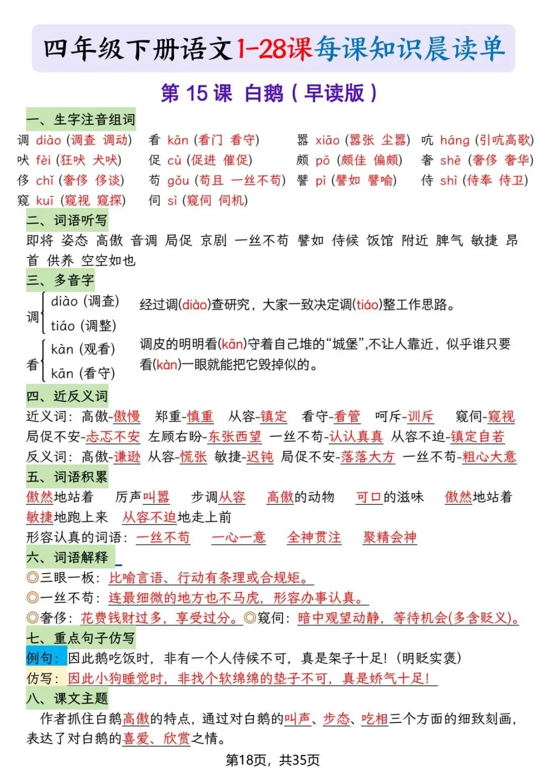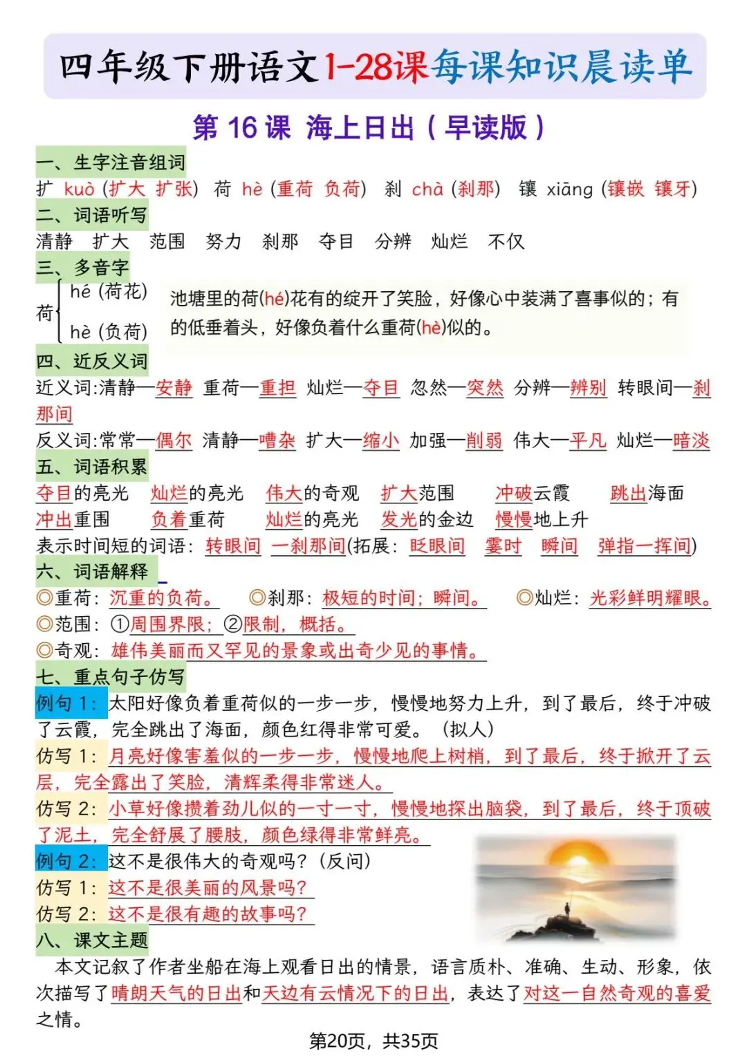 2026年春人教部编版四年级下册语文《1-28课每课知识晨读单》,电子版可下载打印。该四年级语文1-28课每课知识晨读单包括生字、重点句子、词语积累、课文主旨等内容,有需要的老师家长快给孩子们打印学习吧。