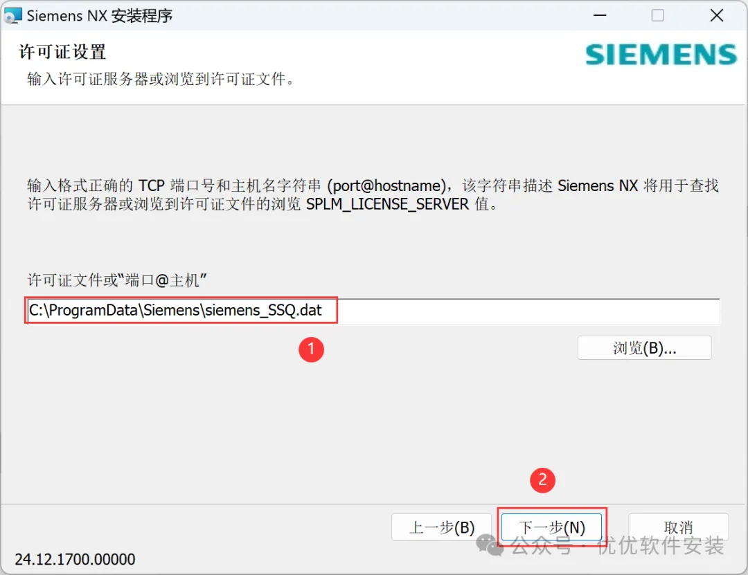 22、许可证文件输入:C:\Program Files\ Siemens\ siemens_SSQ.dat,再点击【下一步】