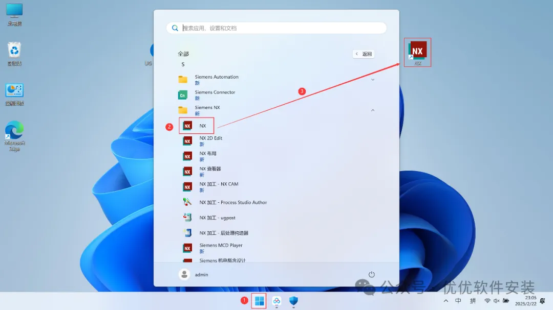 29、回到桌面,点击任务栏的【开始菜单】,在【所有应用】中找到【NX软件图标】,将软件图标拖到桌面上,完成软件桌面快捷方式的创建