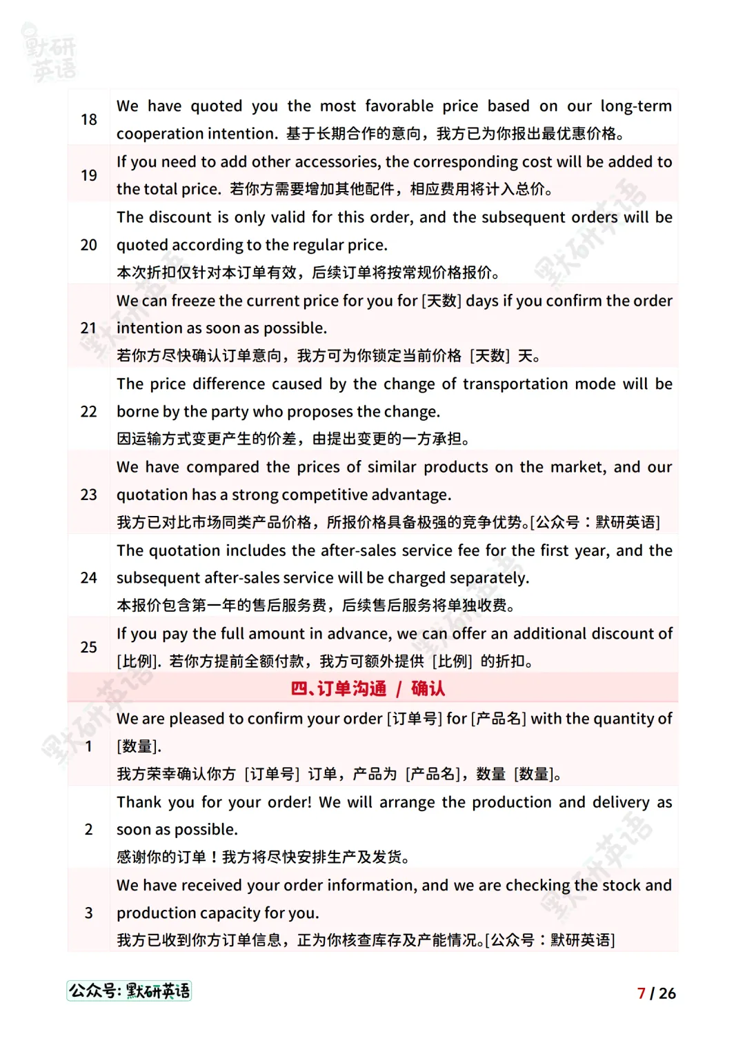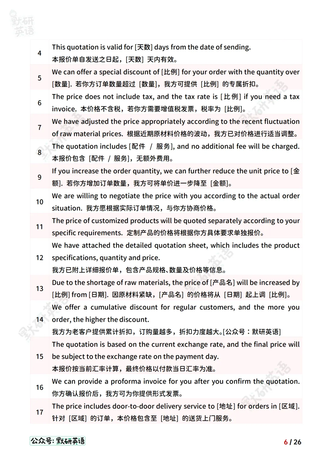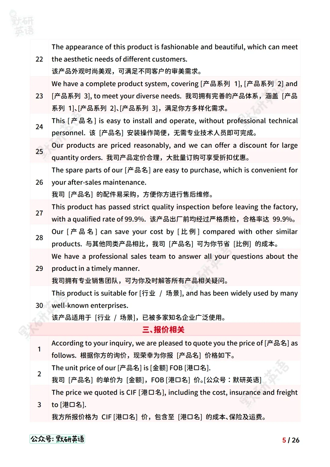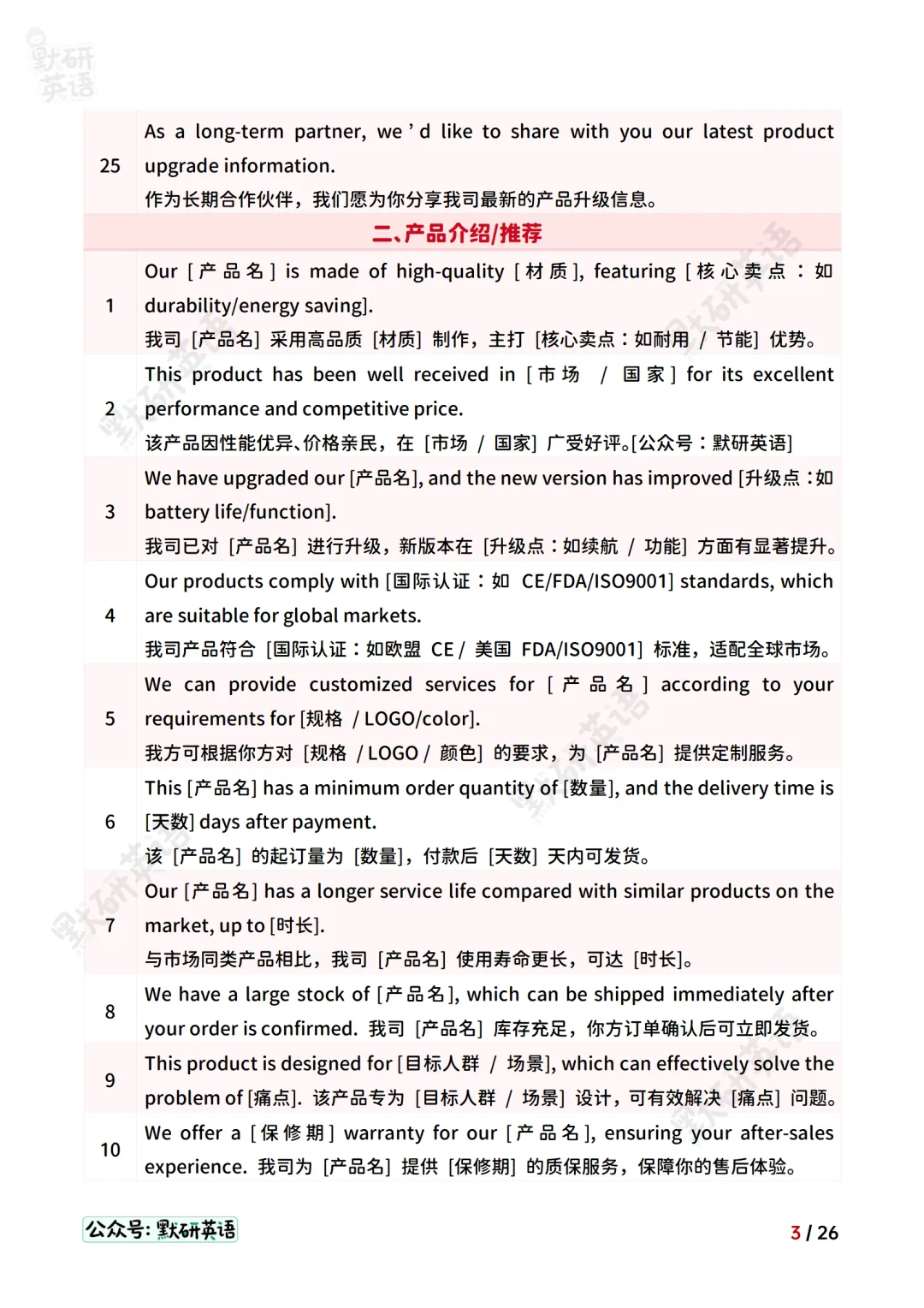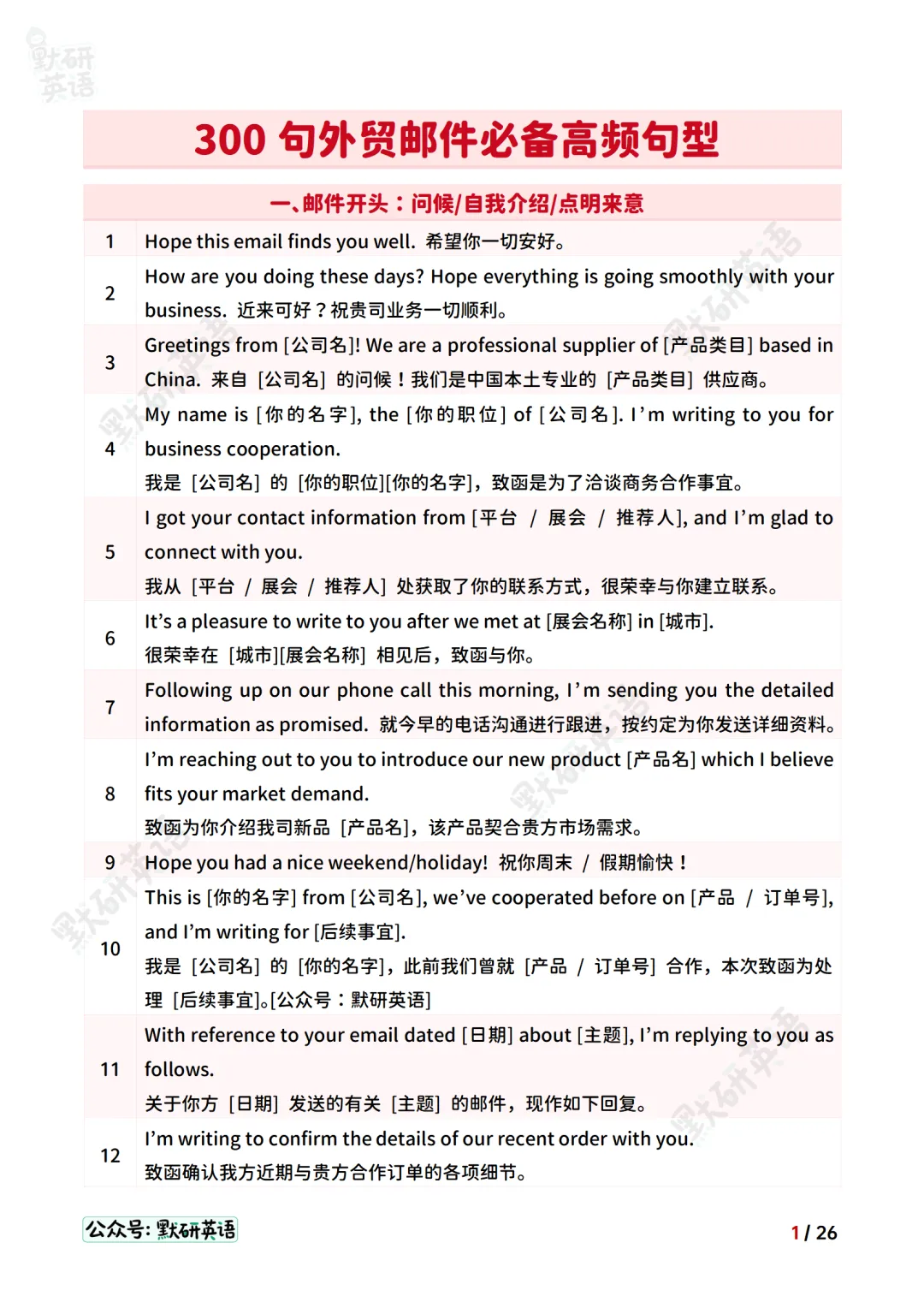 10 大核心场景全覆盖:开头问候 / 产品推荐 / 报价沟通 / 订单确认 / 物流付款 / 售后处理 / 展会邀请 / 合作洽谈 / 催款跟进 / 特殊通知,还有万能结尾 + 临时情况补充,外贸邮件遇到的所有场景都能找到适配句式!