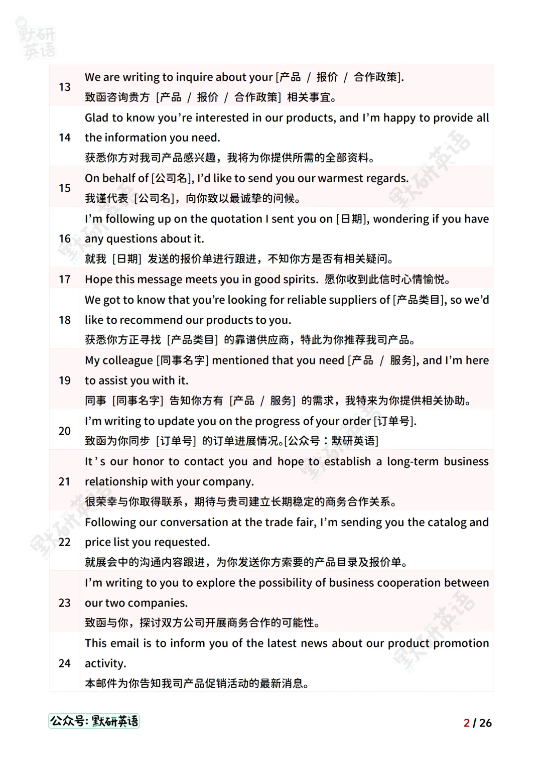 每句都做中英精准对照,不用再逐句查翻译、抠语法,复制替换关键词就能直接用,新手也能写出地道专业的外贸邮件,高效对接客户不踩坑!