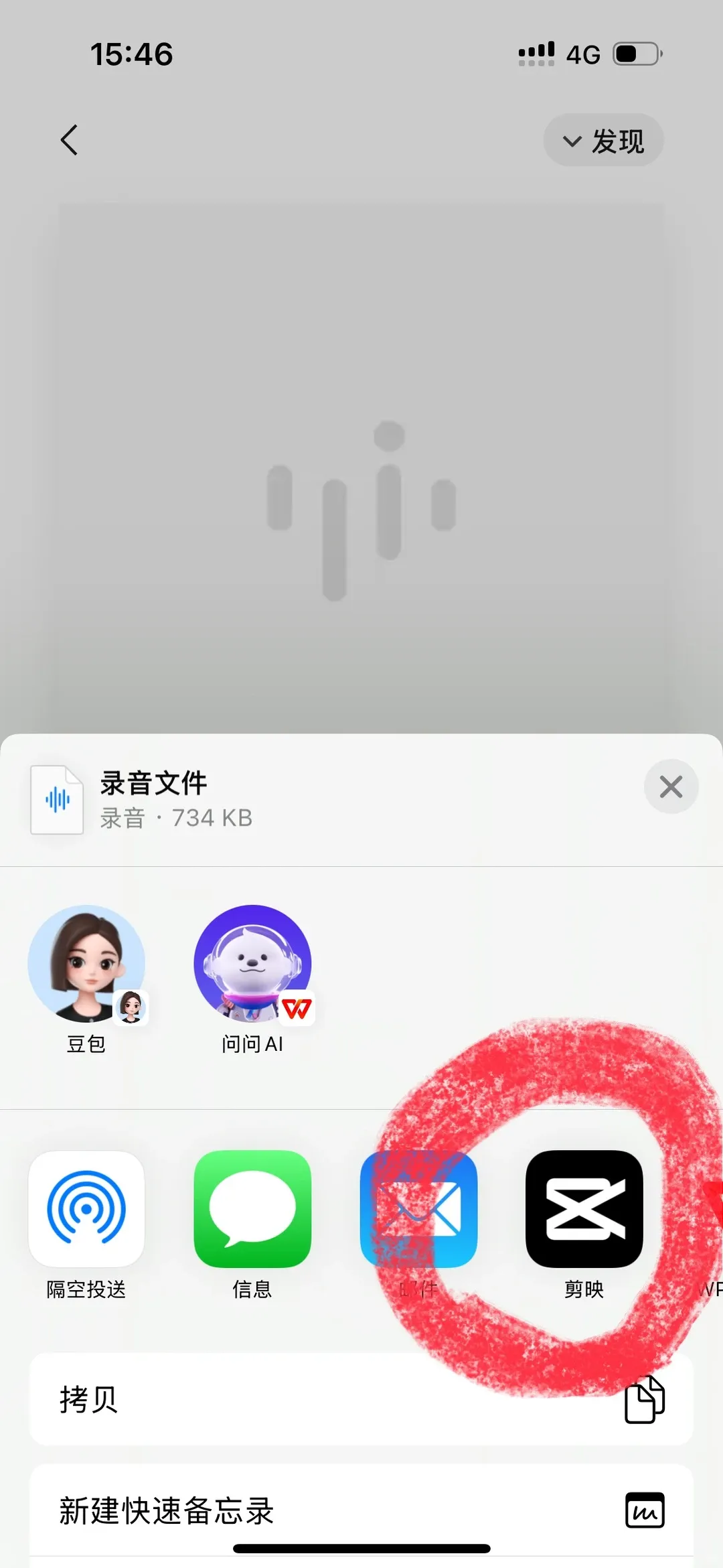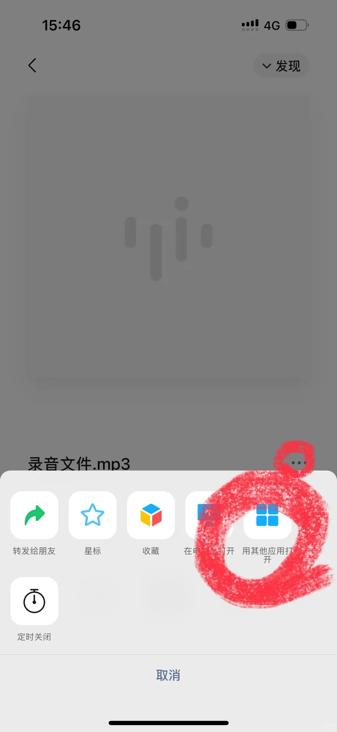 2️⃣点开想要剪辑的音频(此处我是通过微信),点击右边的三个小点,再点击“用其他应用打开”,并选择用剪映打开。