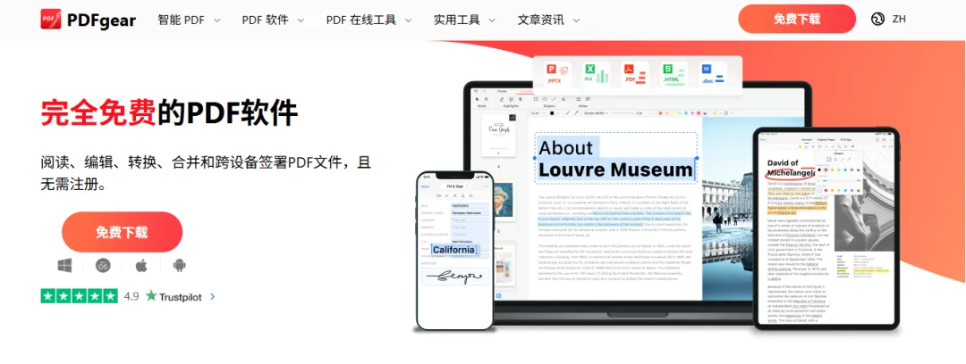 PDFGear 是一款全平台、全功能、完全免费的 PDF 一站式处理软件。它最大的卖点在于“无订阅费、无广告、无水印”,直接对标 Adobe Acrobat Pro 等付费软件的核心功能,但用户无需支付任何费用,主要特性包括: