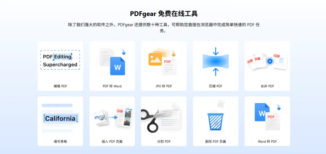不用走开这里还提供了在线工具包括在线编辑、PDF转word、压缩PDF、插入合并PDF等功能。