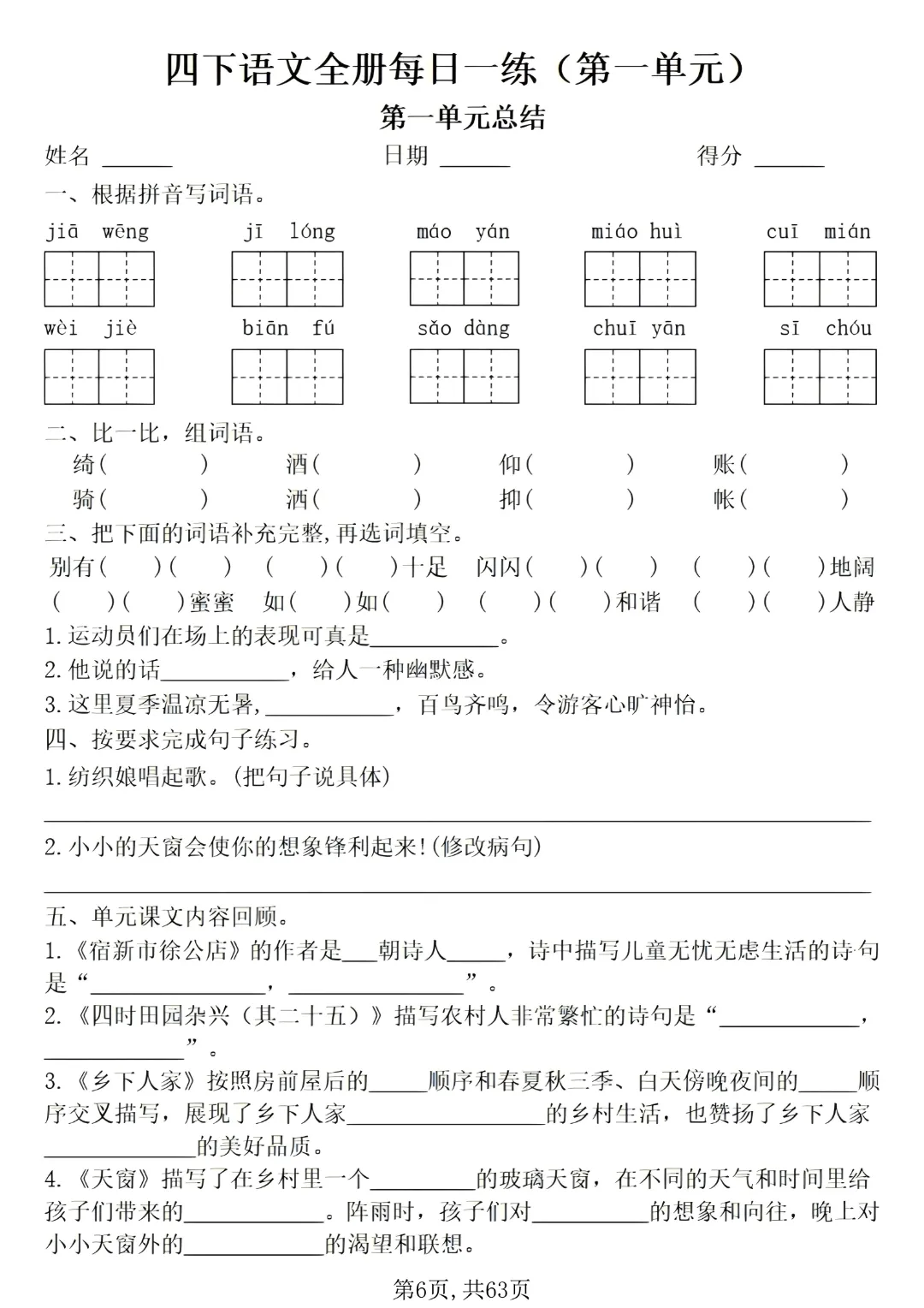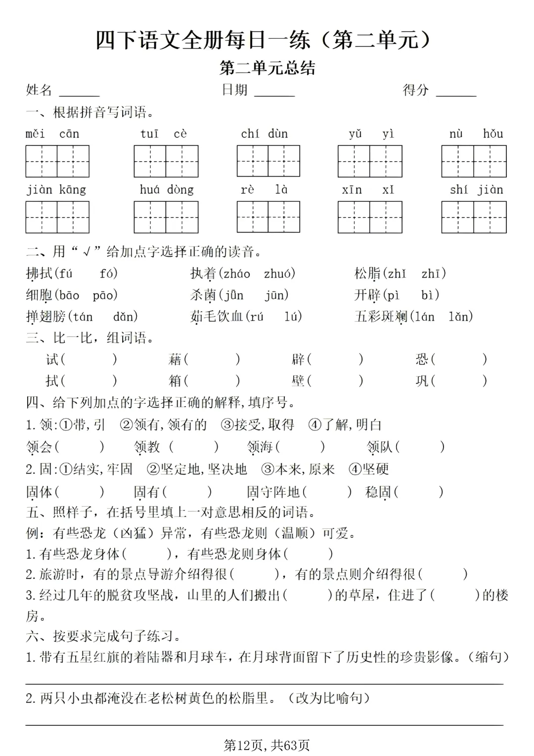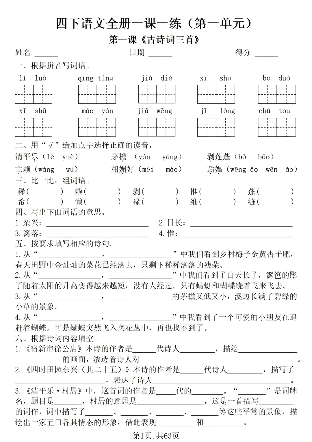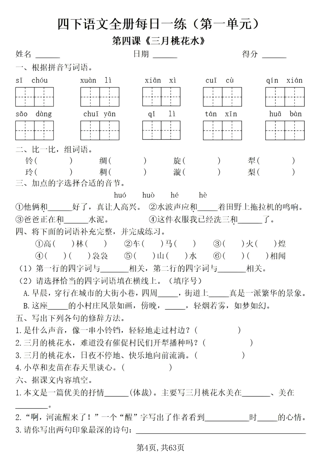 26年春四年级下册语文《一课一练 部编版》练习·学习必备·高清完整可打印